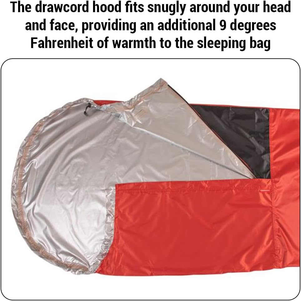 The dcord hood fits snugly around your head and face, providing an additional 9 deges Fahnheit of warmth to the sleeping bag.