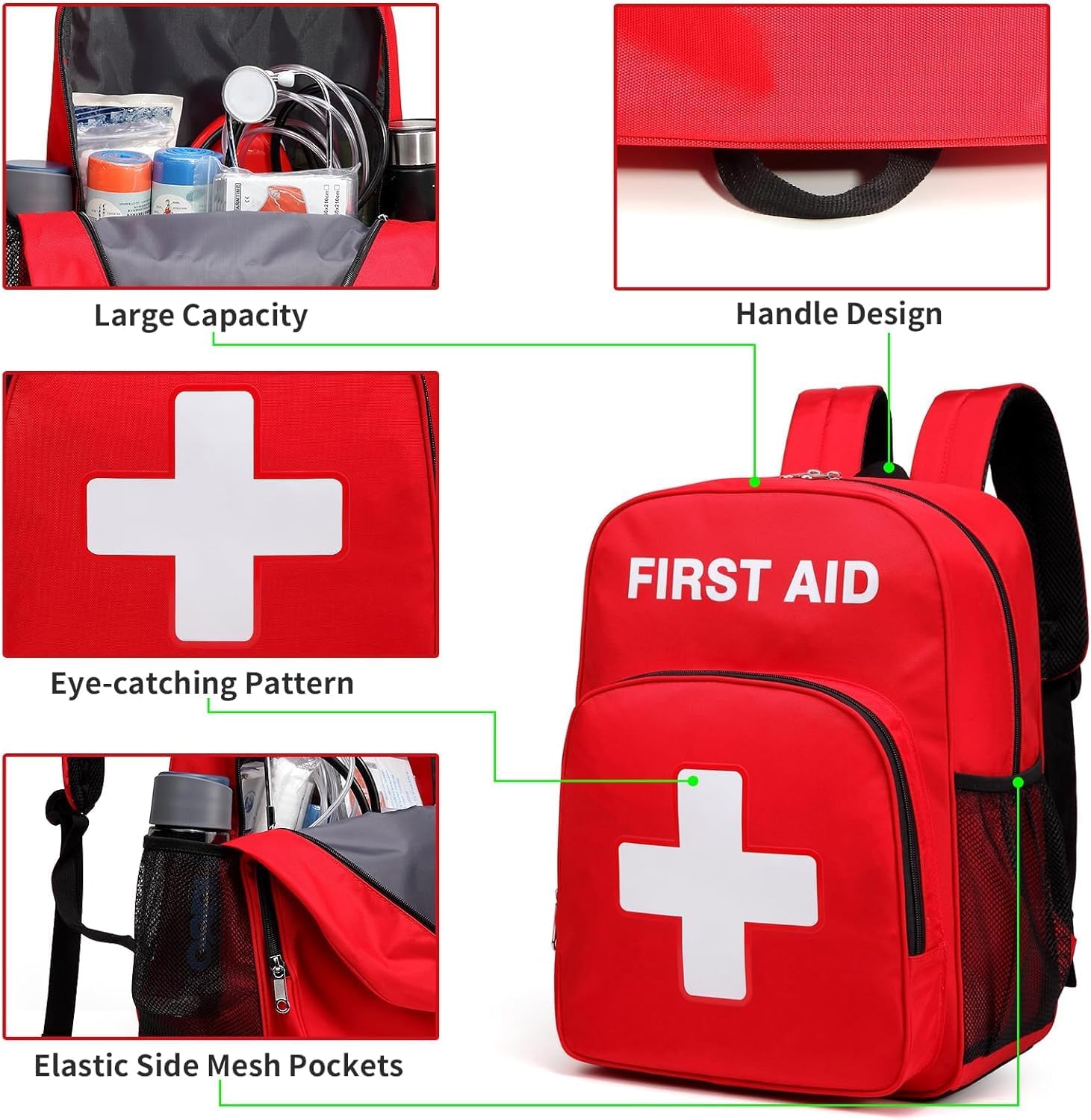 EYE-CATCHING CROSS DESIGN: The overall design of medical backpack is eye-catching in red and features a white cross symbol, which can help you quickly find your backpack.