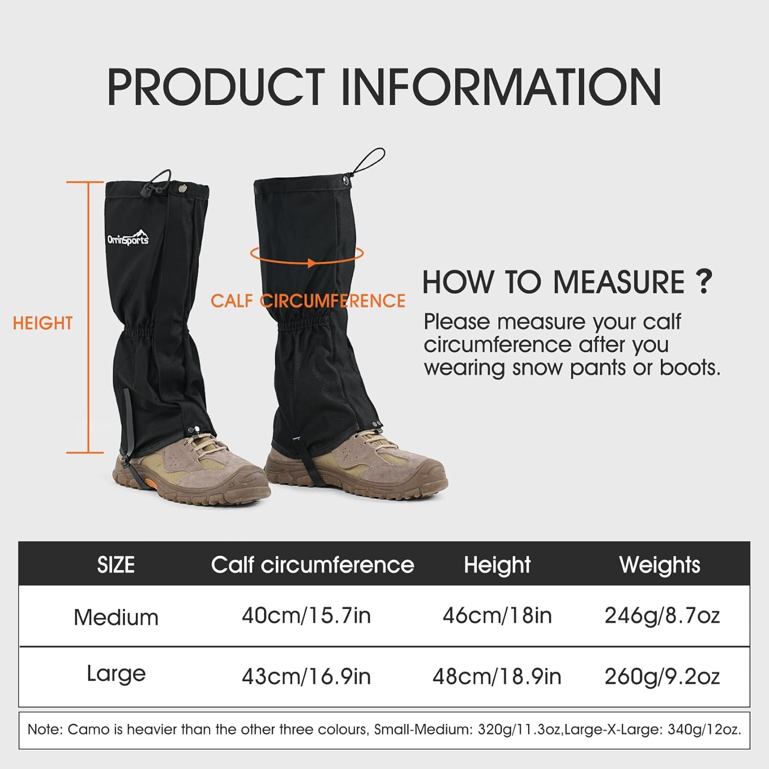 1.Snowproof & Waterproof Boot Gaiters Designed with high-density waterproof fabric, these long leg gaiters keep your boots and pants dry by blocking snow, rain, and mud. Perfect for winter hiking, trekking, hunting, and outdoor work.