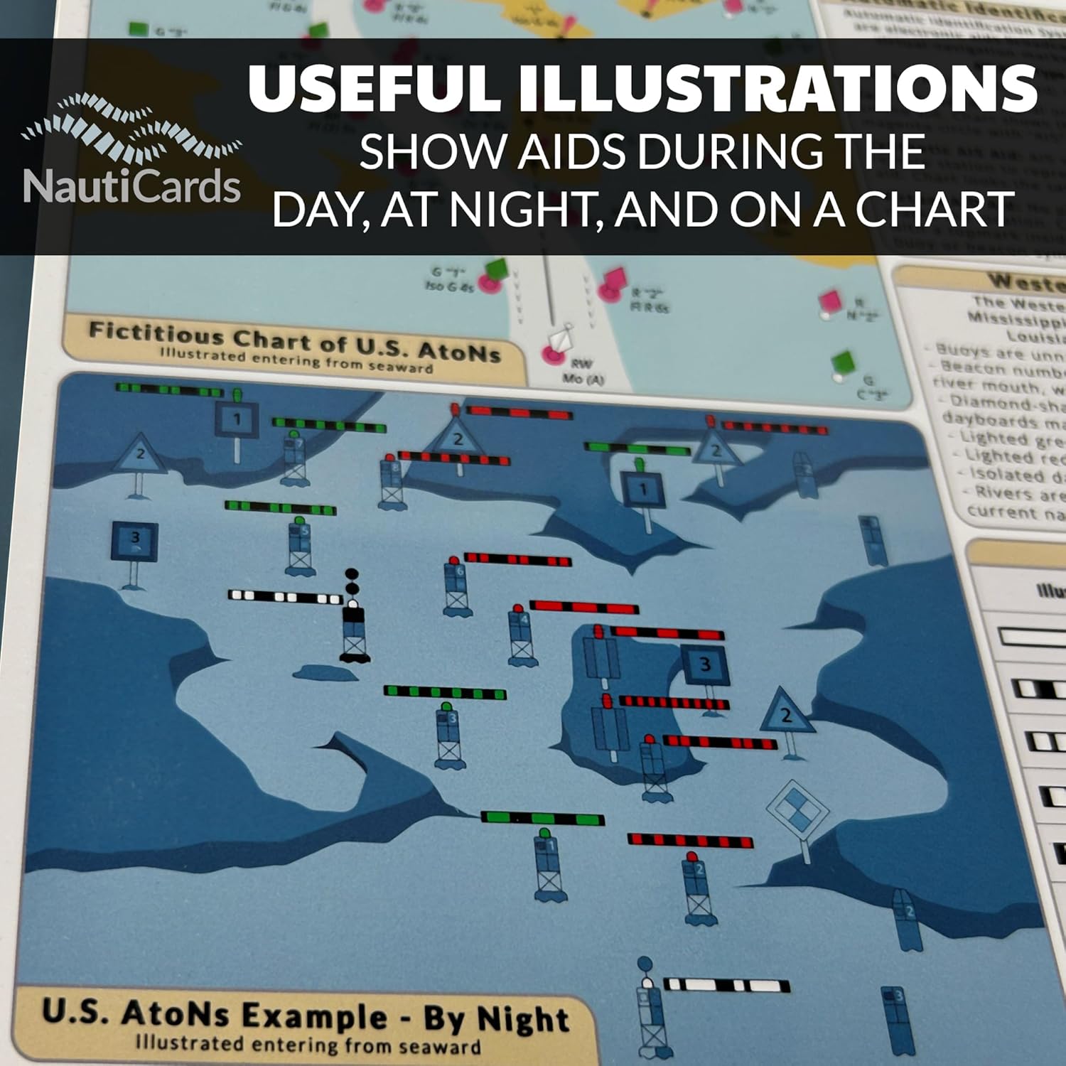 Extremely Thorough: Covers U.S. Aids to Navigation system including comprehensive graphics of boat buoy types, lateral marks, dayboards, safe water marks, AIS symbols, bridge lights, and much more.