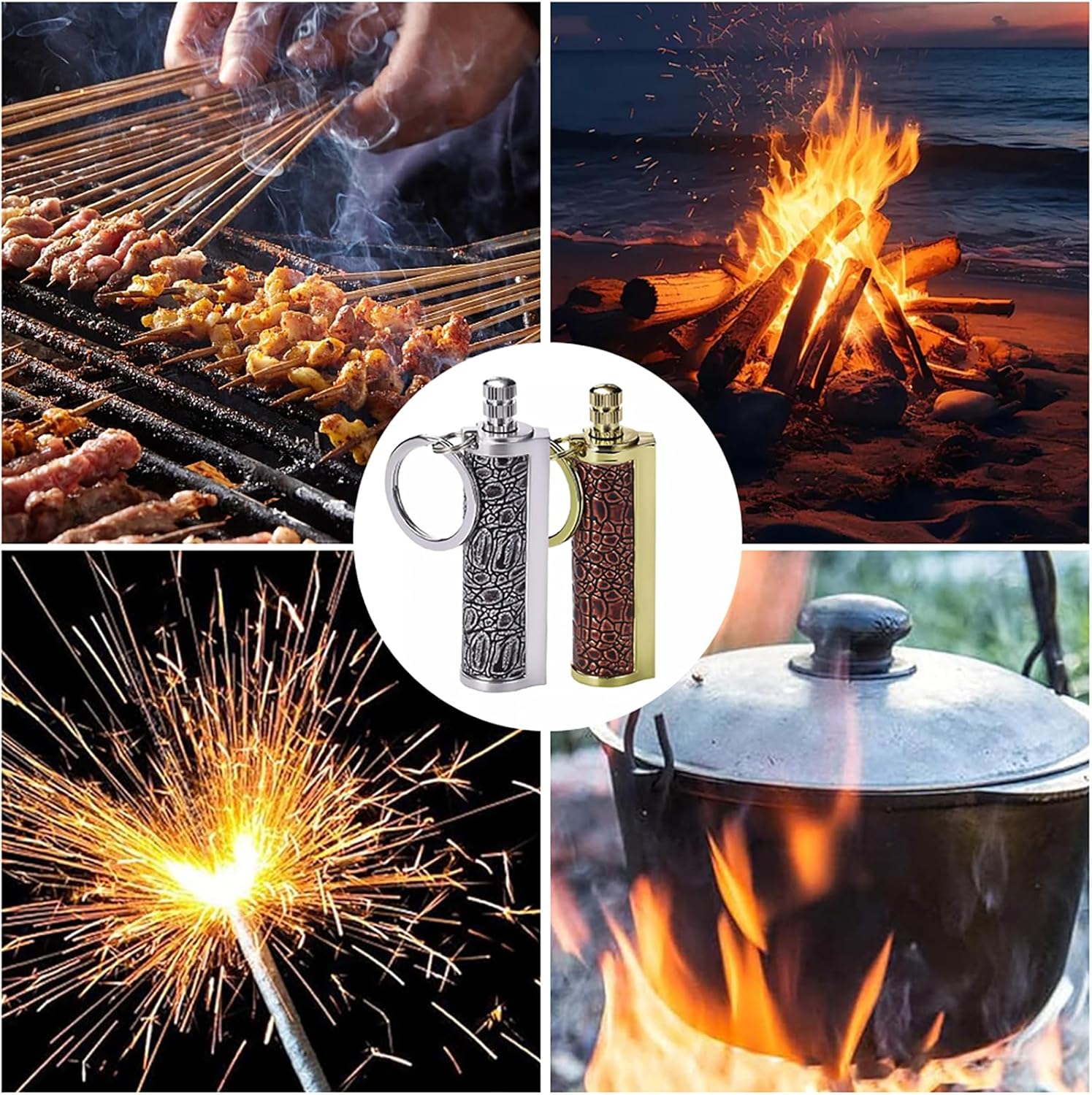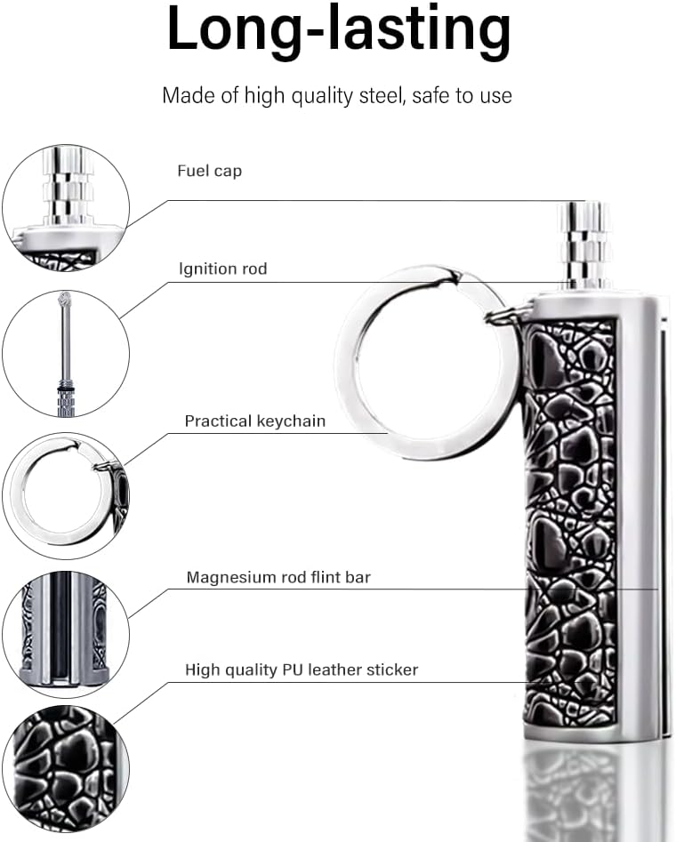 DURABLE: The flint starter and adjustable cotton can endure at least 10,000 strikes. premium quality magnesium core striker. Fuel can be replenished and can be used thousands of times. This permanent match keychain is made of alloy material, well-made, able to withstand repeated use without any problems.
