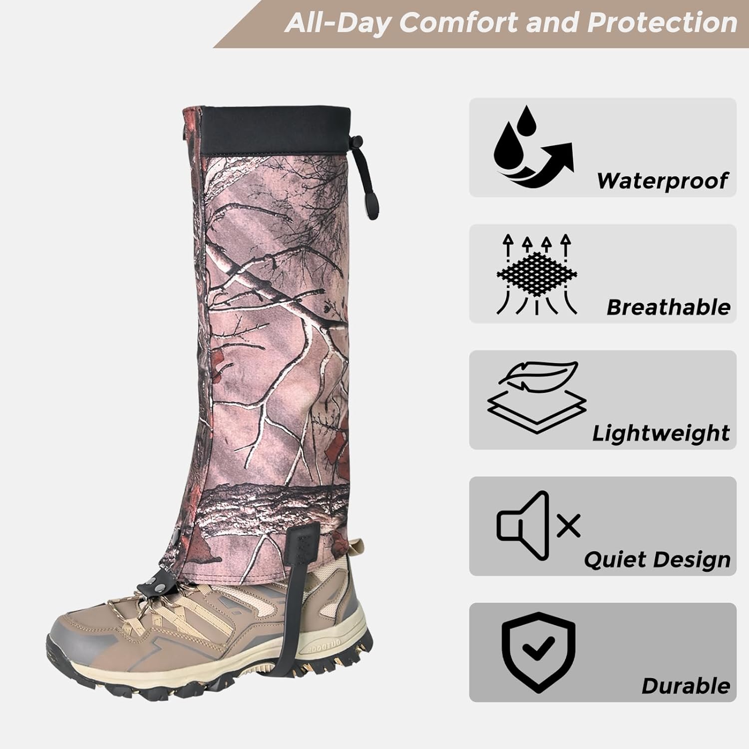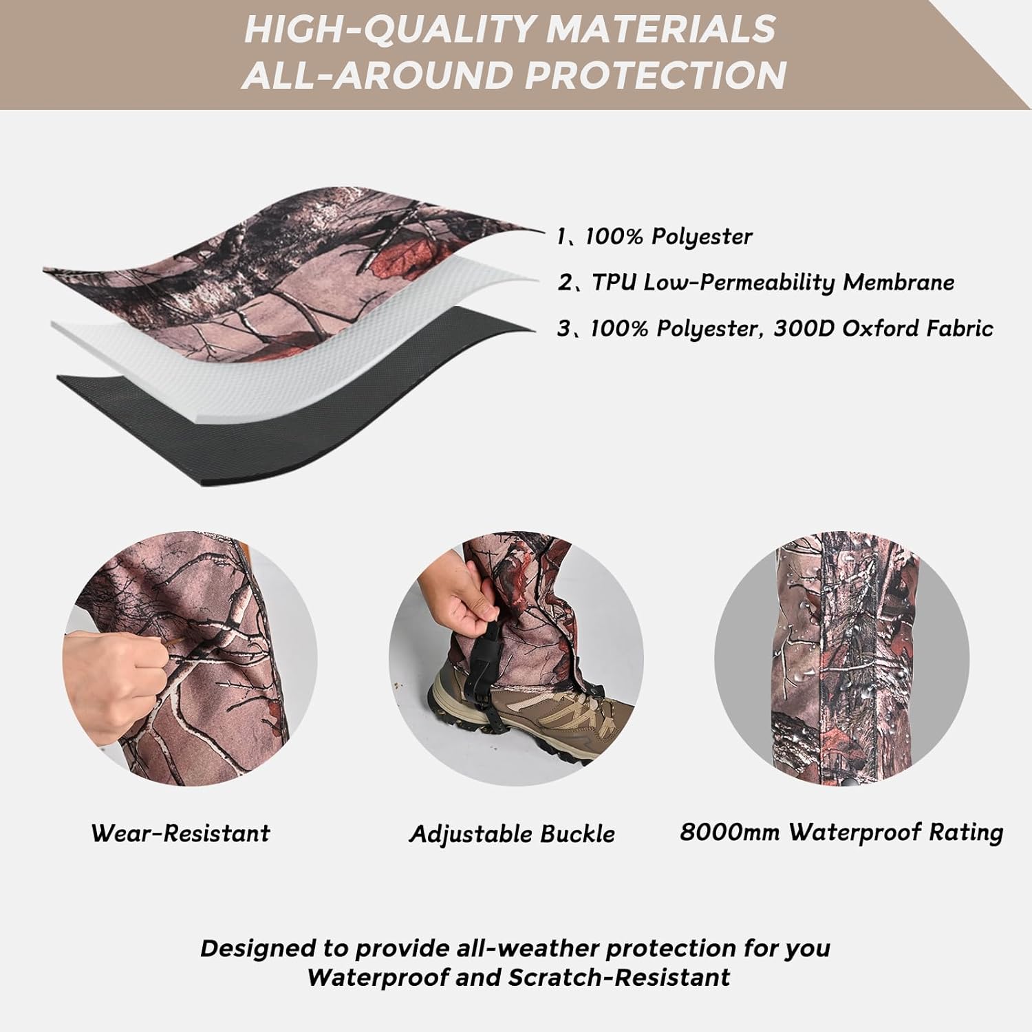 【Waterproof 3-Layer Composite Fabric】 Built with upgraded 3-layer construction,outer Oxford fabric, protective middle layer, and waterproof inner lining, these gaiters keep your legs dry and shielded from mud, water, and rough terrain.