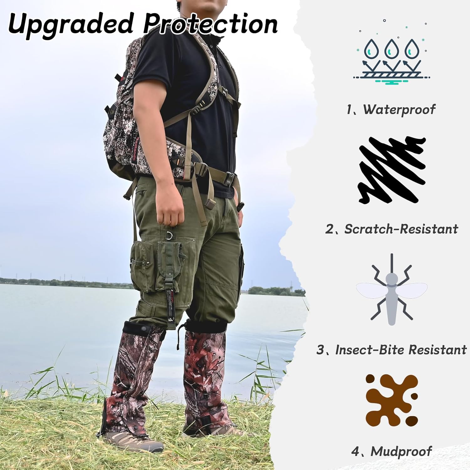 【Durable and Anti-Puncture Performance】 Reinforced with tough Oxford and high-density materials, the gaiters resist tearing, punctures, and scratches from thorns or rocks, ensuring lasting durability for outdoor use.