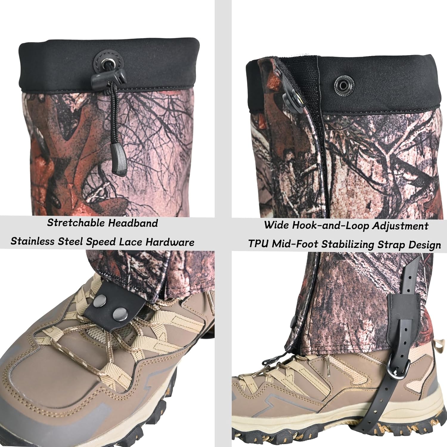 【Adjustable Fit and Secure Closure】 Equipped with adjustable top straps, foot buckles, and strong front closure, these gaiters stay securely in place over any hiking or hunting boots for a snug, comfortable fit.