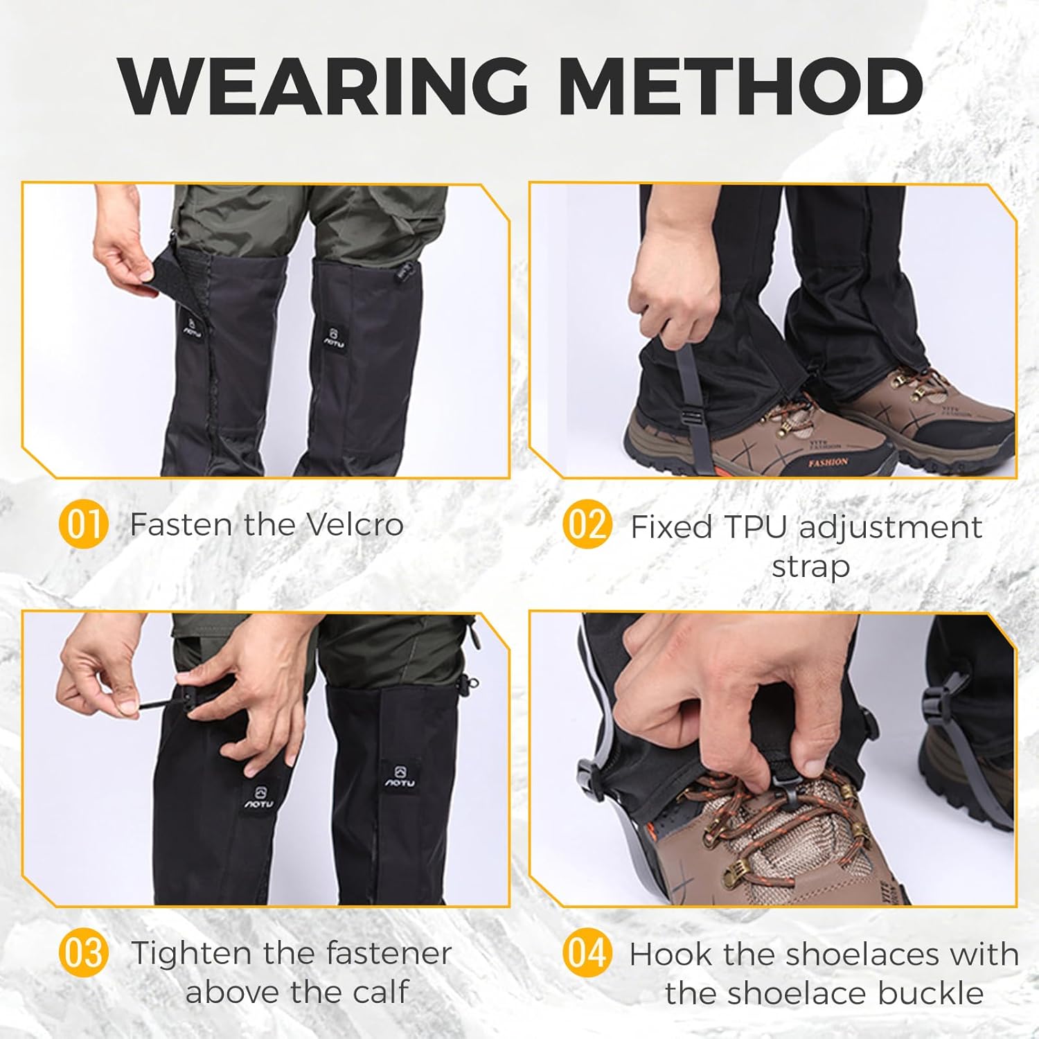 EASY ON & OFF: Designed for convenience, the wide self-adhesive closure opening and simple strap system make these gaiters quick to put on and remove. Ideal for motorcycle gaiters or quick transitions between different outdoor activities. Suitable for outdoor jungles, snow, mud, rock climbing, hiking, and other scenarios.