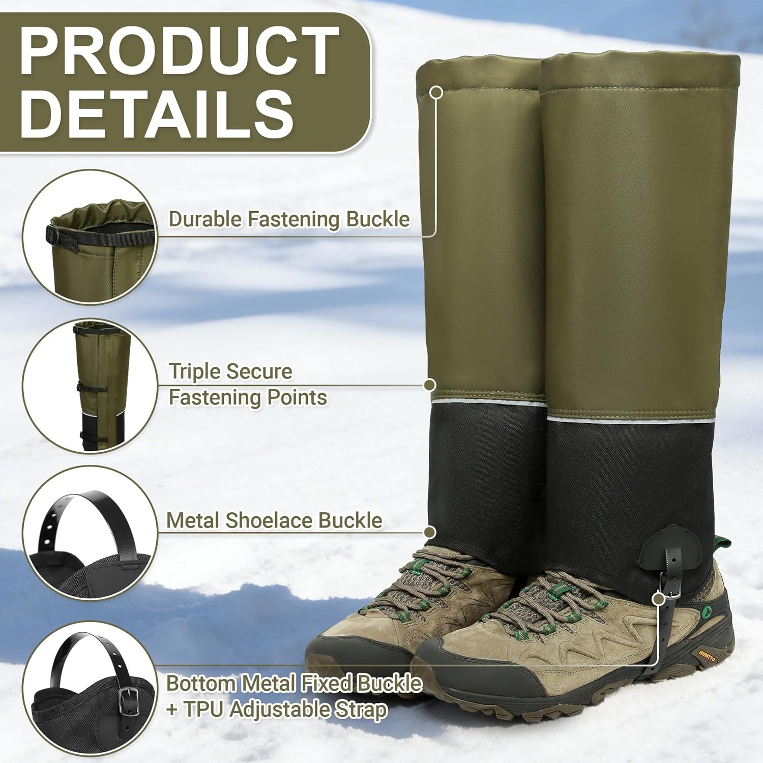 3. Upgraded TPU Material, Enhanced Durability We’ve upgraded the straps with high-quality TPU, tightly stitched for tear resistance and long-lasting use. Equipped with sturdy metal buckles, these snow gaiters and winter gaiter stay firmly fixed to your shoe soles, withstanding harsh outdoor conditions.