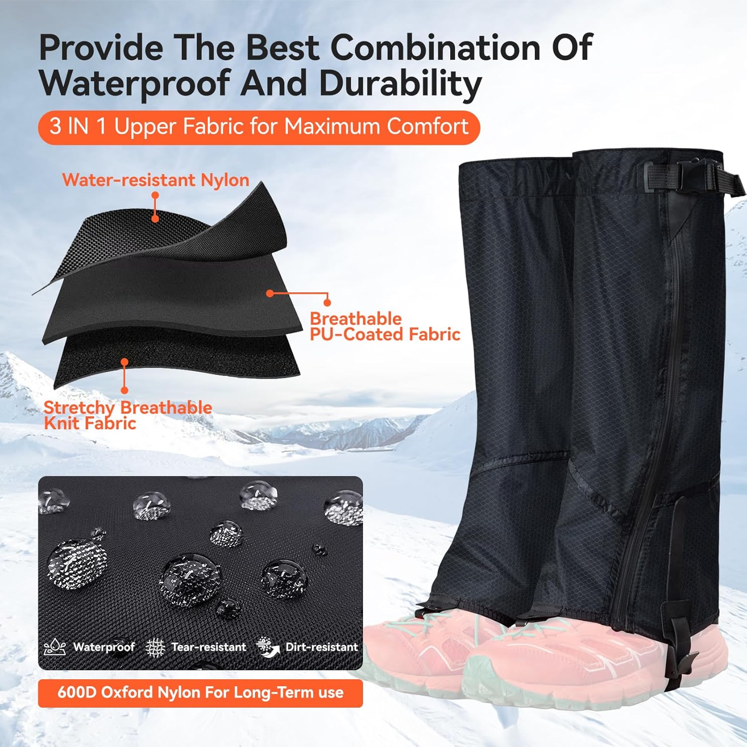 KEEP YOUR LEGS DRY WITH RUGGED HIKING GAITERS – Engineered for deep snow, muddy trails, and rocky terrain, these gaiters for hiking boots stop water, dirt, and snow at the source—giving you clean, dry, and comfortable steps on every adventure