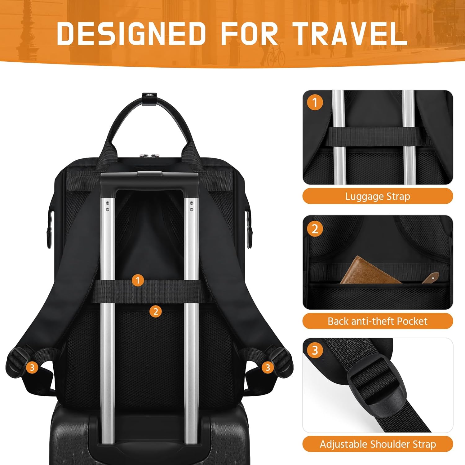 Luggage Strap Design: The laptop bag back features a luggage strap that allows the travel backpack to be securely attached to your luggage, freeing your hands. A back hidden anti-theft pocket ensures the safety of your valuables, making it ideal for air travel