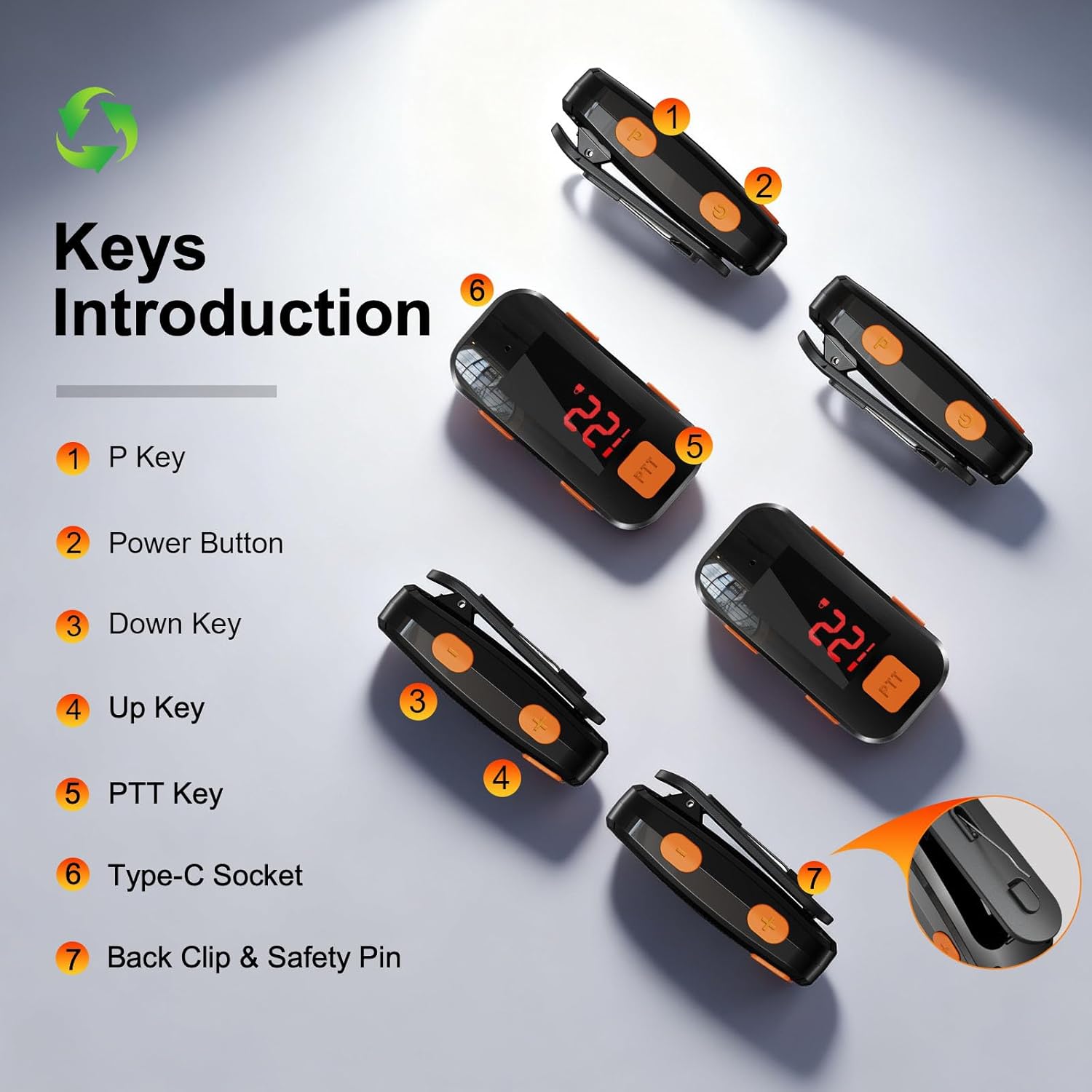 Eco-Friendly Mini Walkie Talkies : Mini two way radio only 2 inches & 0.7 oz, lightweight & portable; Eco-designed with back clip & safety pin, can easily attach to the collar or fasten it on your shirt. Remove speaker and pair with bulit into antenna earpieces to work; Offer 360 rotating headset and 3 sizes of earcap to adapt different earholes of each users. For stable wearing, place the earcaps under the ear cartilage when wearing them.