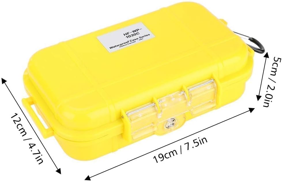 MATERIAL —The Dry Box box is mainly made of ABS engineering plastics and hardware stainless steel accessories, boat dry box has anti‑rust and wear resistant, durable and sturdy design. Impact-resistant, crush proof and waterproof polycarbonate material.FULL PROTECTION — The Dry Box inner with detachable rubber pad can protect the terms inside from collision and damage. The ultimate personal protective utility case for any adventure! Impact resistant, crushproof, dustproof, IP67 waterproof ! (Note:It is not suitable to be used for outdoor diving underwater.)APPLICATION — Diving dry boxes Suitable for storing some EDC tools, phone, keys, etc. This waterproof dry box will keep your wallet, phone, and other valuables safe. Prevent potential damage from sliding around during movement on your boat, kayak, and general transport. With a carabiner hook, Easily hang into your backpack/bags.SIZE — Waterproof phone box outside Approx. 19 * 12 * 5cm / 7.5 * 4.7 * 2.0in, Inside dimension : 18 x 9 x 5cm /7 x 3.5 x 2 in, Fine workmanship, considerate design and exquisite appearance, 5 colors Black, Transparent, Yellow, Red Optional.PORTABLE — This small waterproof case is lightweight and compact, convenient to carry and store. Whether you’re hiking, sailing, kayaking, backpacking, boating or paddleboarding, our Protective Box will never let you down.