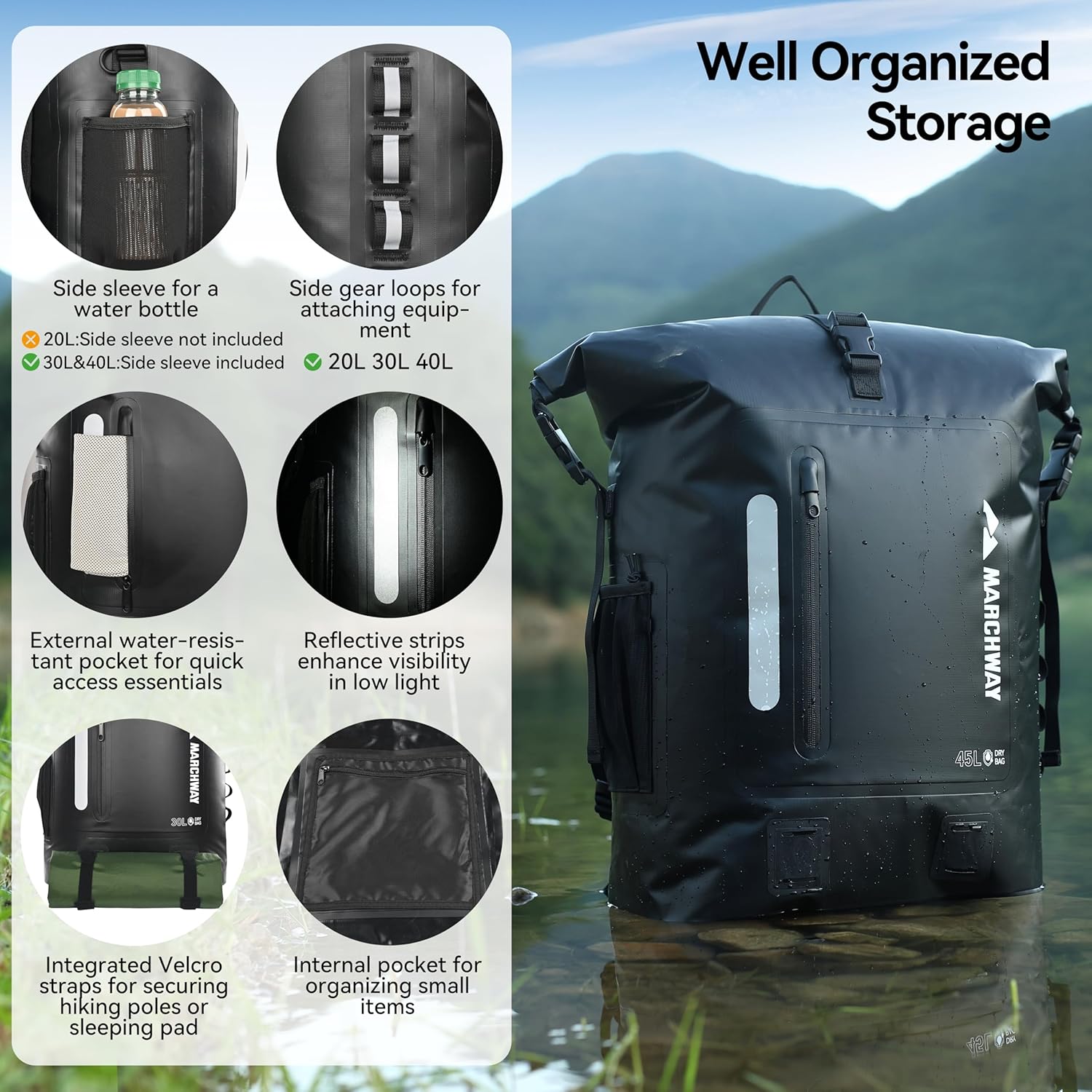 Multi-Compartment Organization: 20L for short trips, 30L for day trips, 45L for multi-day excursions. The waterproof main compartment keeps critical gear dry, with a dedicated internal pocket for compact valuables. Externally, a quick access splash resistant pocket holds flat essentials. Side MOLLE loops secure bulky accessories, bottom Velcro straps hold extended gear like trekking poles or mats.