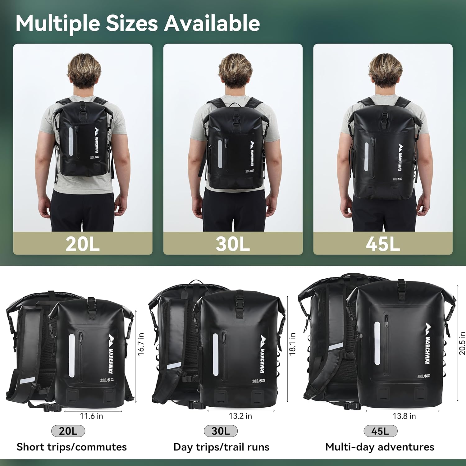 20L is ideal for short trips and commutes. 30L is designed for day trips and trail runs. 45L is built for multi-day adventures.