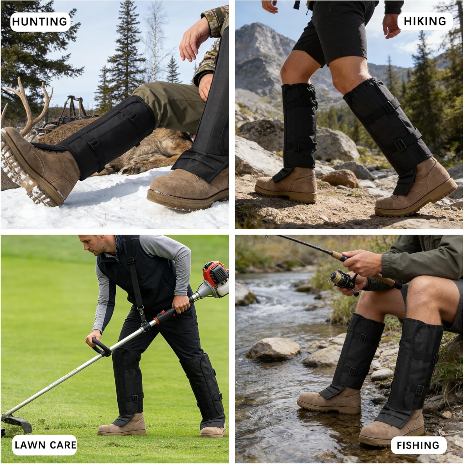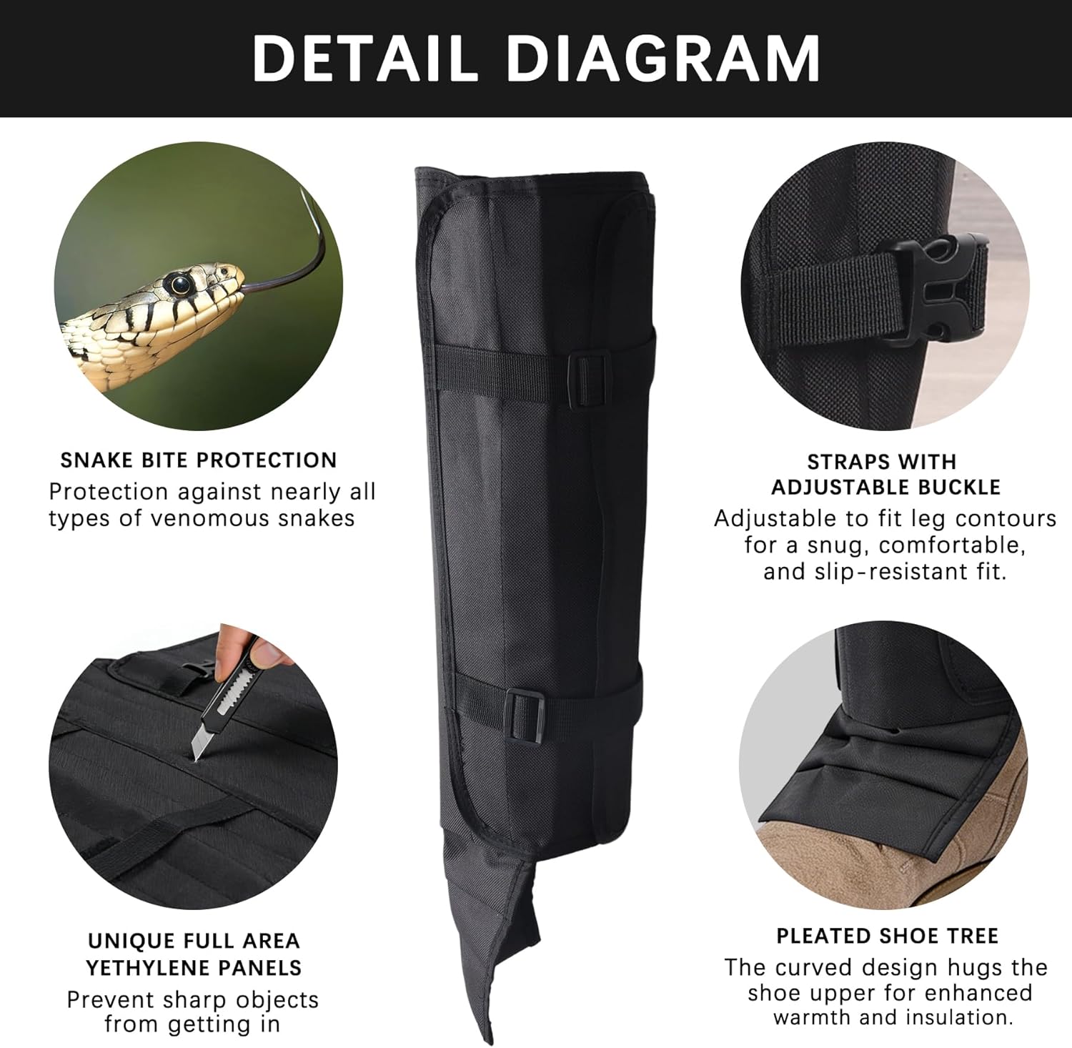 Durable Snake Gaiters: these snake gaiters are crafted from tear-resistant, waterproof Oxford fabric and high-density PP panels. They feature a robust construction with a premium waterproof coating. They provide protection against rain, snow and snakebites while remaining breathable, making them ideal for outdoor work and hunting.