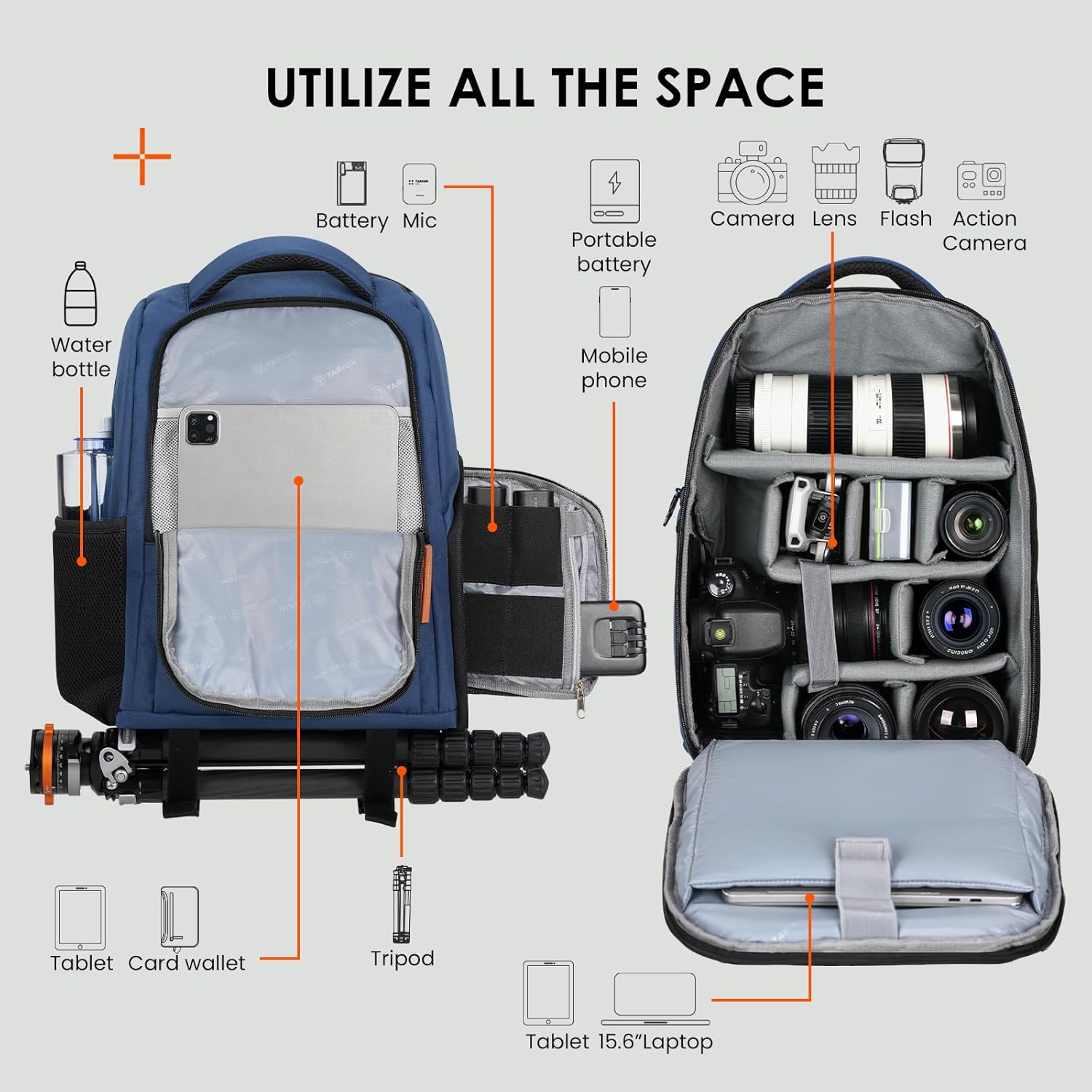 【Large Capacity】 This professional camera bag can hold 1 camera 6 lens 1 flash trigger. Inside there is a zippered mesh pocket for accessories, iPad and other tablets etc. High-elasticity mesh sides pockets can used for bottle and umbrella etc.