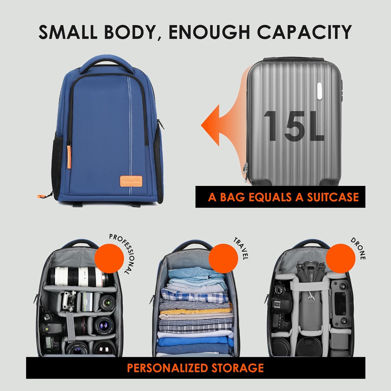 【Multi-Functional】 This camera backpack can be easily converted into a lightweight flexible simple straight city day-pack by removing the camera compartment dividers. Super easy to use for small day trips, there’s enough room for personal gear. If you are not satisfied with our camera backpack or have any question, please feel free to contact us. TARION is always here.
