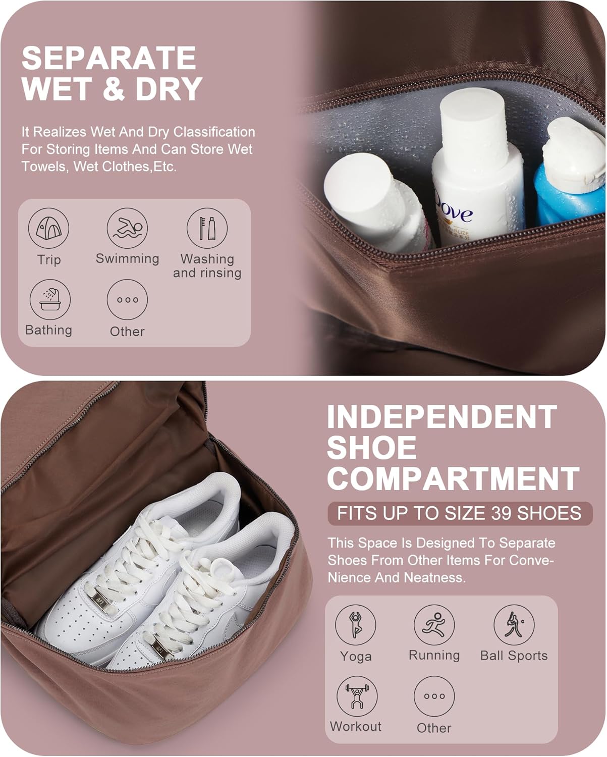DELICATE DETAILS:Designed with convenience in mind, this gym bag features a shoe compartment to keep sneakers separate from your clothes. Never worry about dirty shoes contaminating clean clothes again!Not only are our fitness backpacks lightweight, collapsible, and easy to store, but they also come with a wet pocket for wet items and an anti-theft pocket for valuables like wallets. Stay organized and worry-free during your workout or adventure.