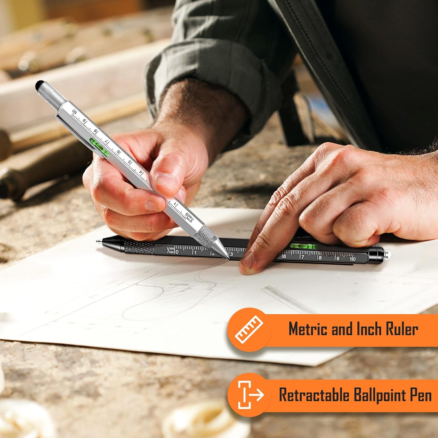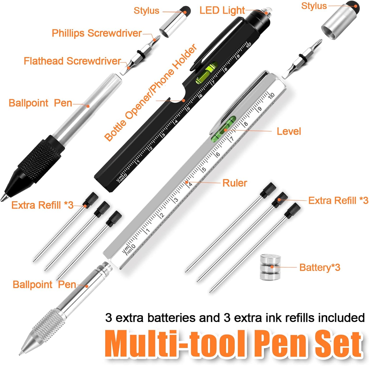 【9-in-1 Multitool Pen Set】Multitool Pen Set Has 9 Handy Functions. LED Flashlight, Retractable Ballpoint Pen, Centimeters / Inches Rulers, Bubble Level, Stylus Pen, Screwdriver (Flat & Phillips), Bottle Opener / Phone Holder. the Packaging of 9-in-1 Multifunctional Tool Pen is Exquisite, Very Gifts Fathers Day Gifts