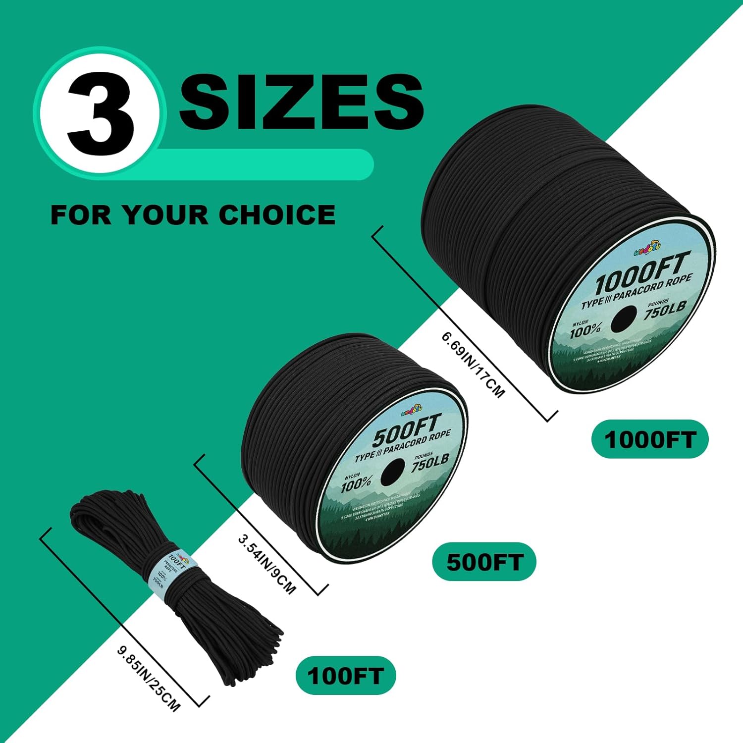The Tangle-Free Paracord: Got the 100ft roll? It comes with a handy strap—just cut what you need and strap up the rest.Going bigger with the 500ft or 1000ft? Those come on a tough spool that keeps everything wound tight.Throw it in your backpack, toss it in your trunk—it’s built to go anywhere without tangling or mess. Stay ready, without the hassle.