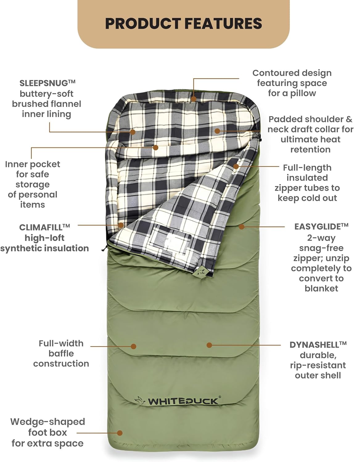 SLEEPSNUG BUTTERY-SOFT FLANNEL LINING WITH PILLOW POCKET DESIGN- Brushed flannel inner sleeping bag feels luxuriously soft and provides natural warmth. Integrated pillow compartment holds your camping pillow securely all night. Heavy duty adult winter camping sleeping bag built for serious outdoor use in harsh winter camping conditions mountains and backcountry.