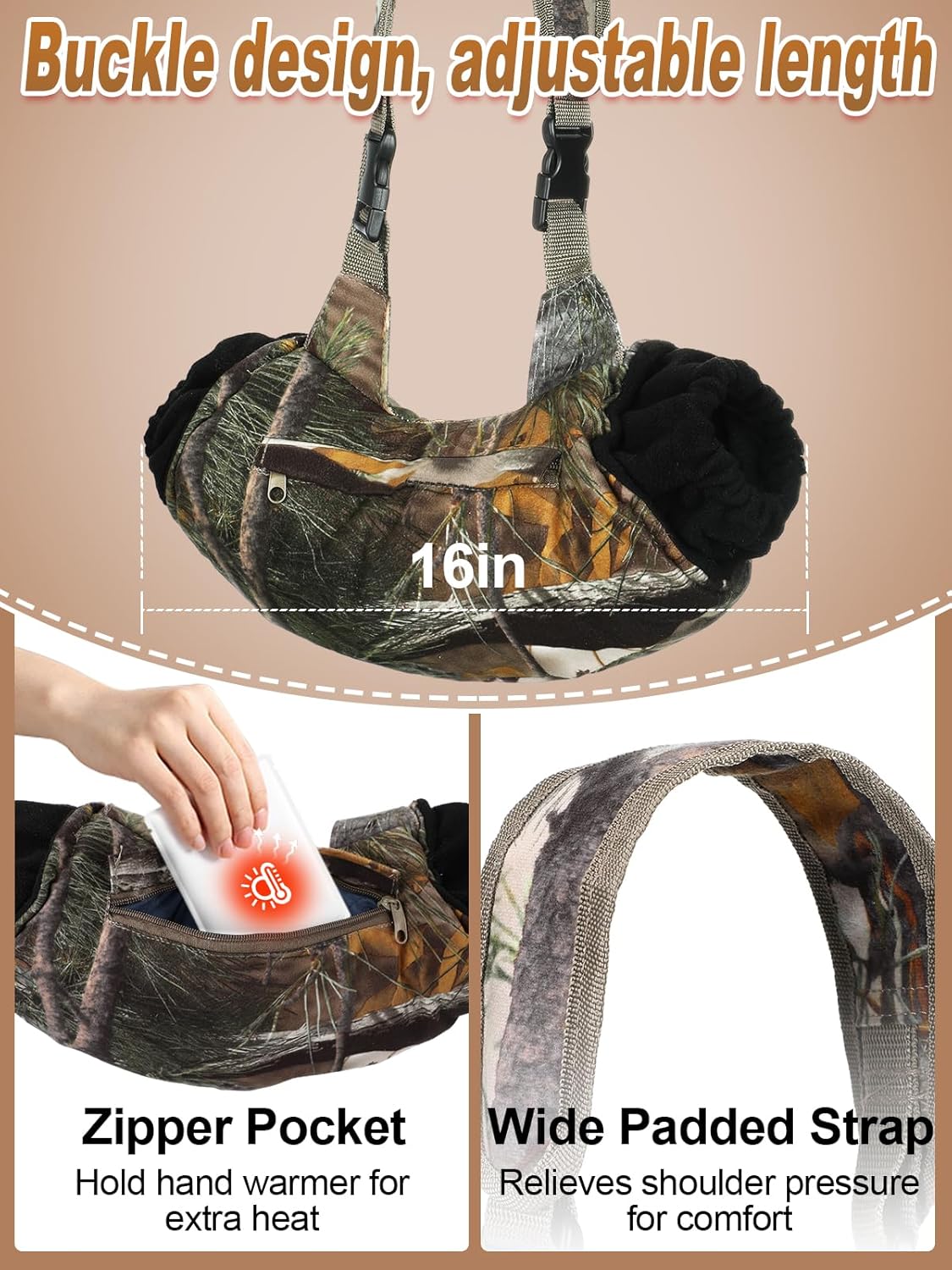 Durable & Adjustable Waist Strap: Made with reinforced stitching, the hunting muff has an adjustable strap that won’t deform. It adjusts easily to fit different waists and stays secure over thick jackets or hunting gear