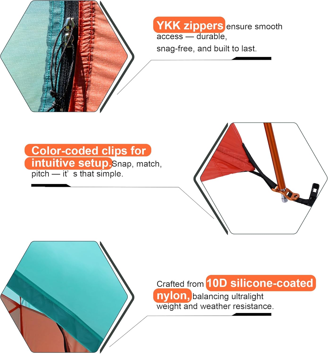 Waterproof & Durable: Lightweight tent Shell Crafted from 10D single-silicone nylon with 2000mm waterproof rating—ultralight 2-person tent yet strong enough for alpine, forest, and wet trails.