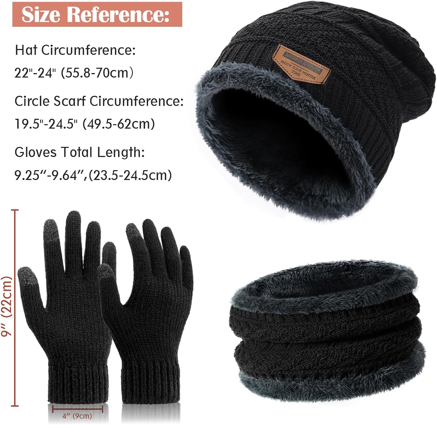 The beanie and Circle Scarf feature thick 100% high-quality polyester on the outside and warm fluffy skin-friendly fleece lining on the inside, makes the hat and neck gaiter super comfy and warm in freezing weather.