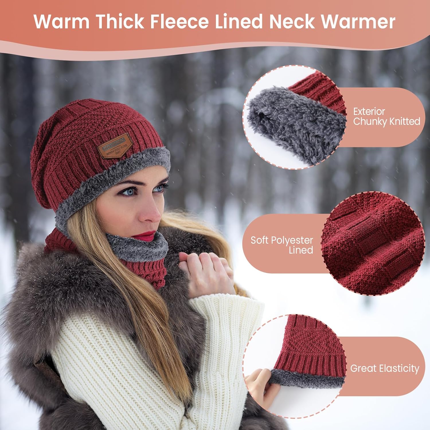 The beanie and Circle Scarf feature thick 100% high-quality polyester on the outside and warm fluffy skin-friendly fleece lining on the inside, makes the hat and neck gaiter super comfy and warm in freezing weather.