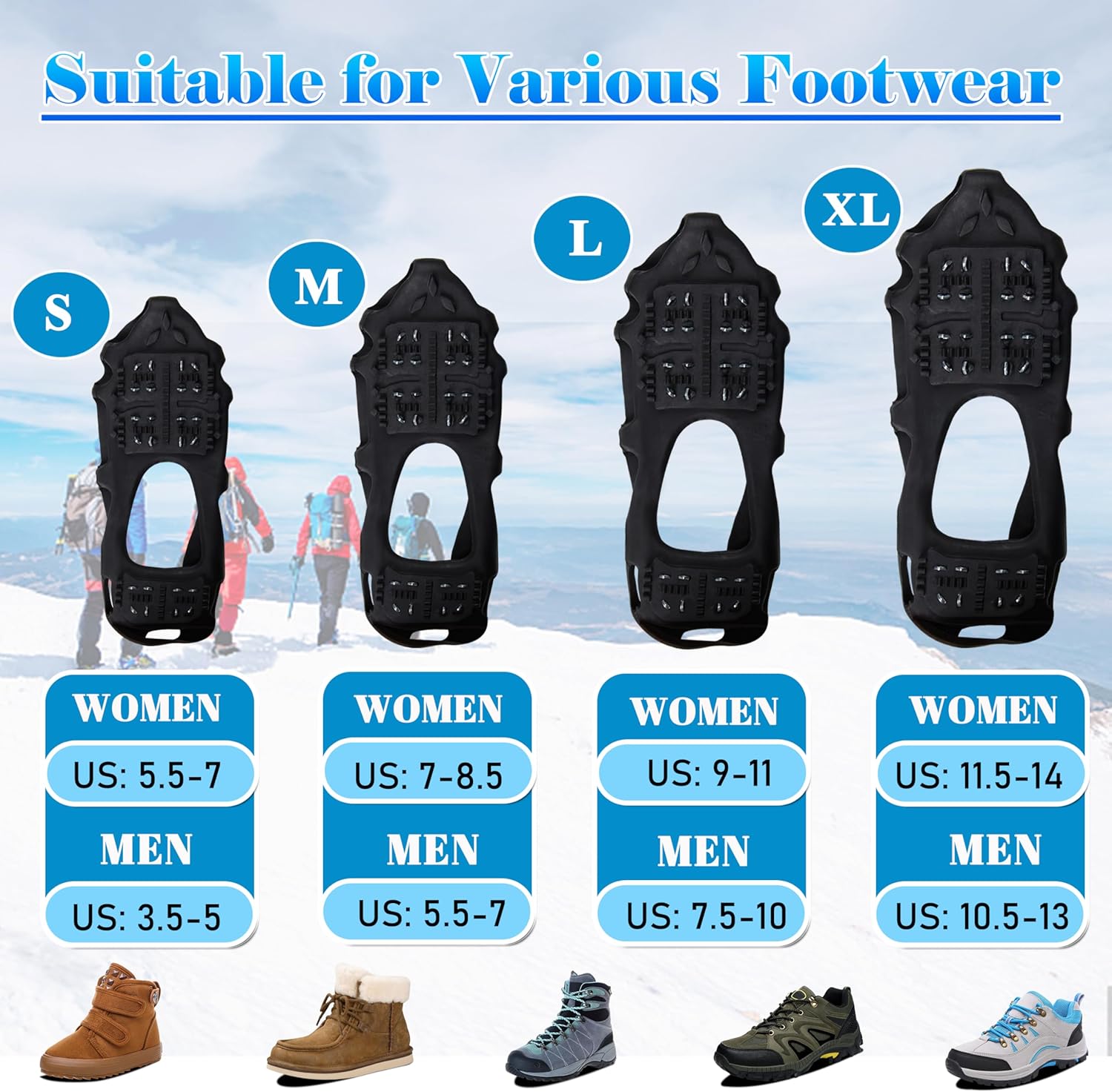 Material: steel & rubberLow temp elasticity for stretchIce & Snow traction cleats can stretch out far enough to cover most sizes of footwearIncrease traction, help you work and walk saferIdeal for mud, outdoor, ice & snow conditions