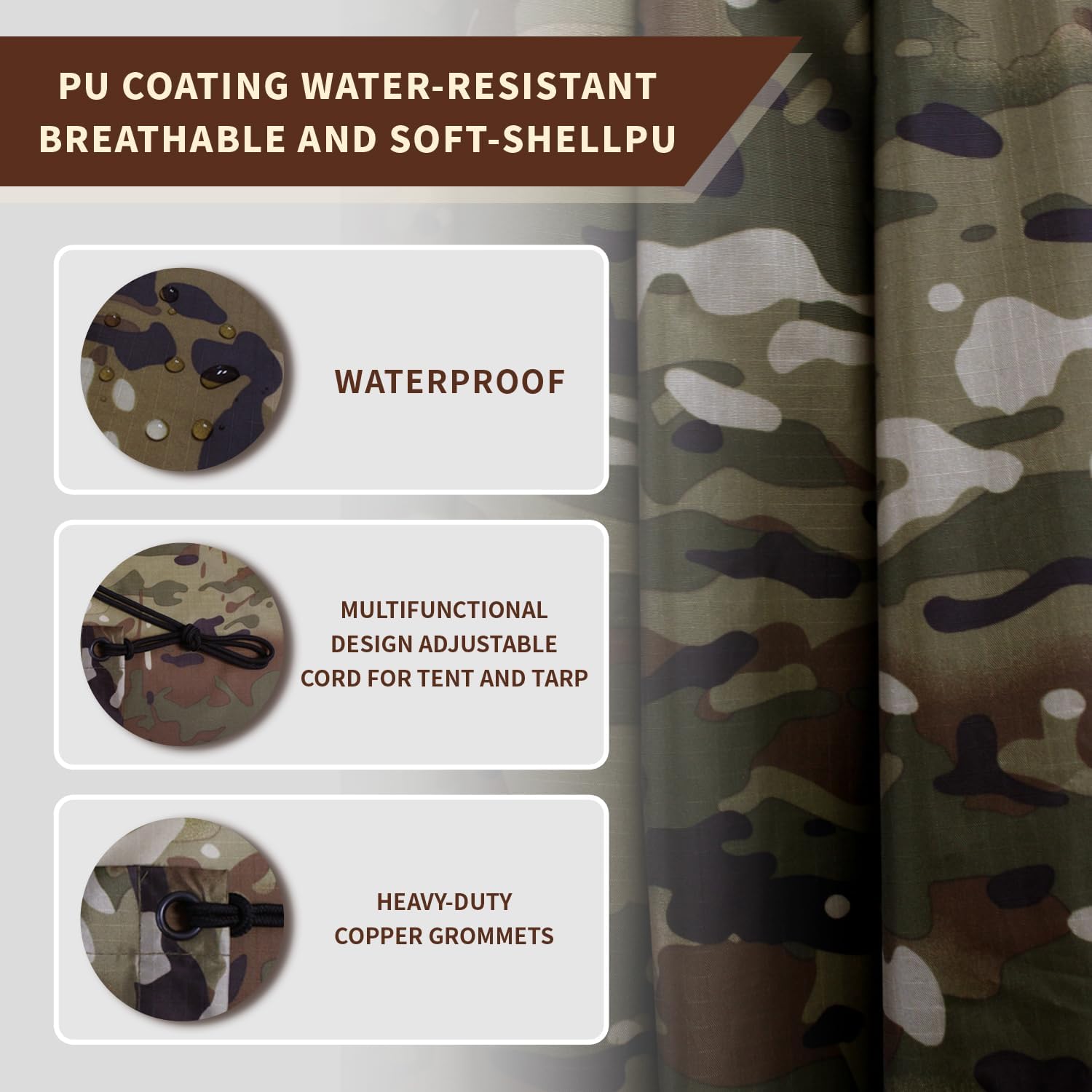 The waterproof camo poncho can be served as an emergency shelter, tent or ground sheet. Snap 2 or more together can build a shelter as big as you need. No tools needed, simply tie the ends together in a knot or drawstrings through the heavy-duty copper grommets.