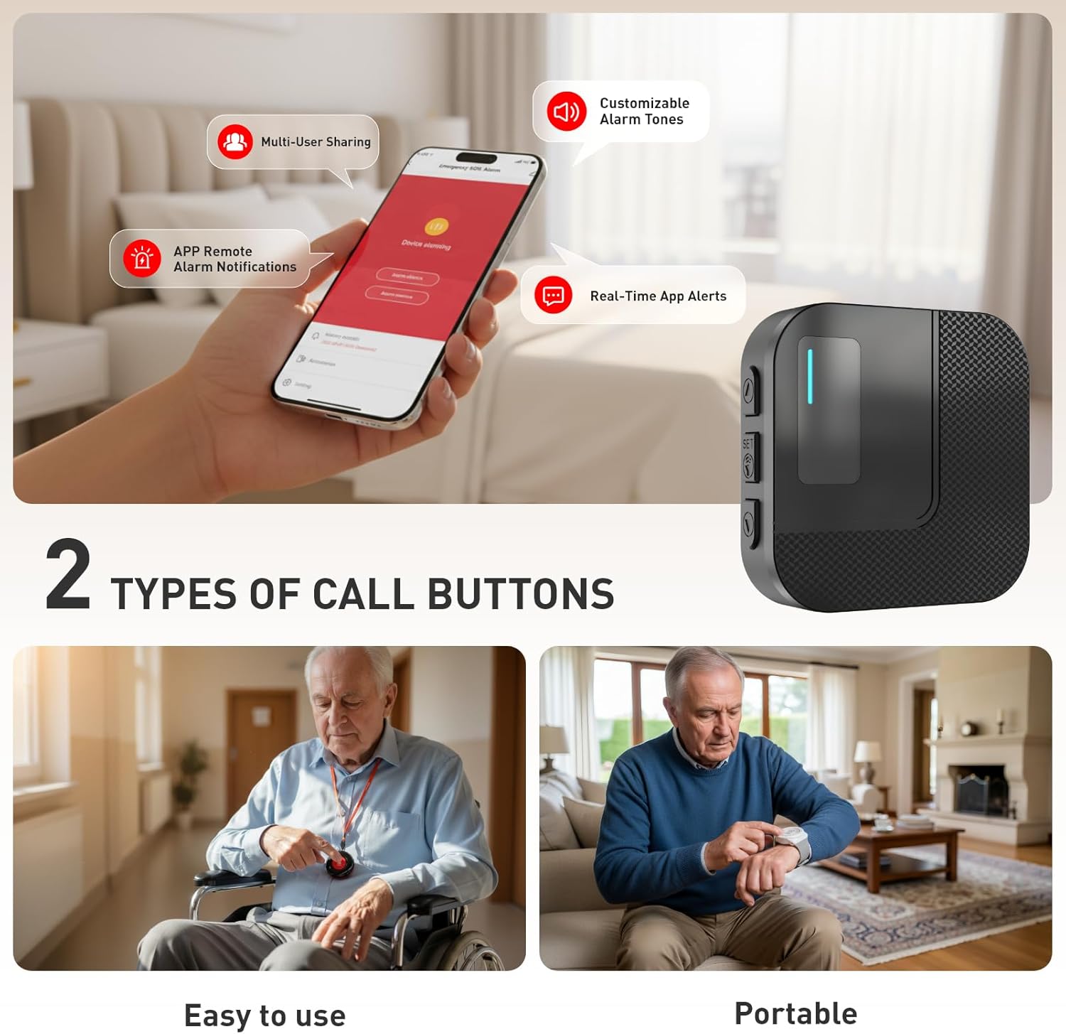 【Are You Still Struggling With Nightly Caregiving?】Have you ever lain awake worrying about your aging parents getting up at night and taking a fall? With a simple press of the call button, the receiver emits a high-pitched alarm with a flashing warning light, while the app sends real-time alerts directly to your phone.