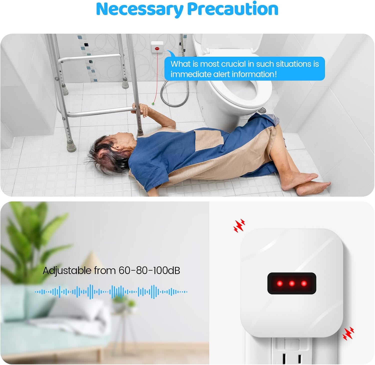 EXCELLENT PERFORMANCE: The emergency call device is highly waterproof and can operate normally in the humid environment of the bathroom. The three-level volume is adjustable from 60-80-100dB to meet your volume needs, and the wireless transmission signal can penetrate a distance of more than 300ft