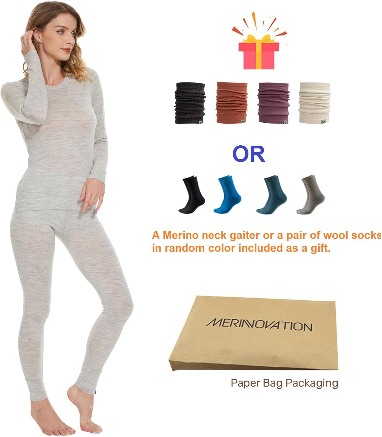 The package includes a wool thermal baselayer set for women with a matching top and bottom, along with a bonus pair of socks or a neck warmer, adding practical versatility and everyday value. Designed for performance in cooler conditions, this merino wool thermal underwear set for women with breathable insulation helps naturally regulate body temperature. Merino fibers provide effective warmth in cold weather while remaining lightweight and breathable, helping maintain comfort during activity and rest. This makes the set suitable as thermal underwear under outerwear or as a base layer within a layered clothing system throughout fall, winter, and early spring.