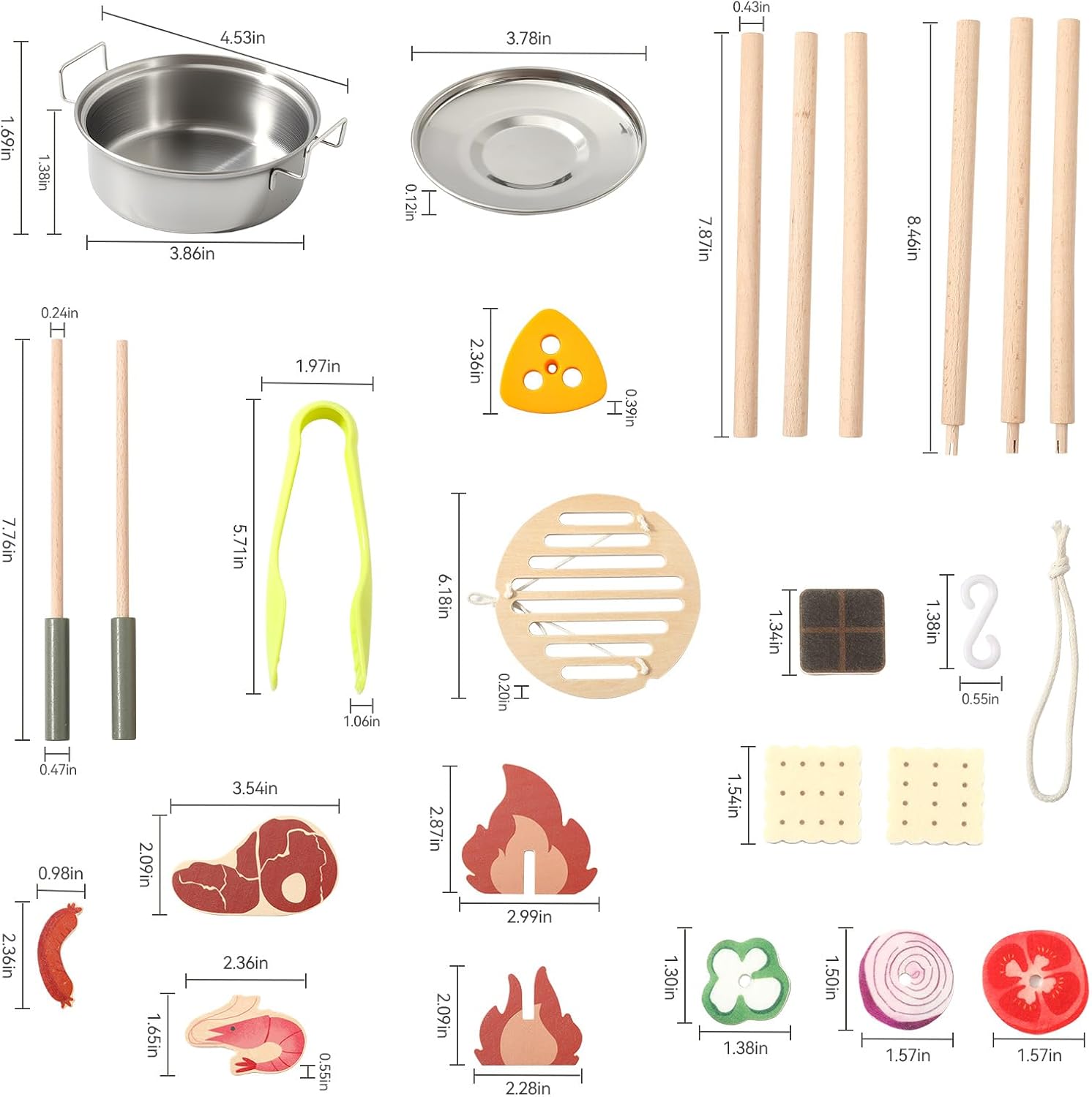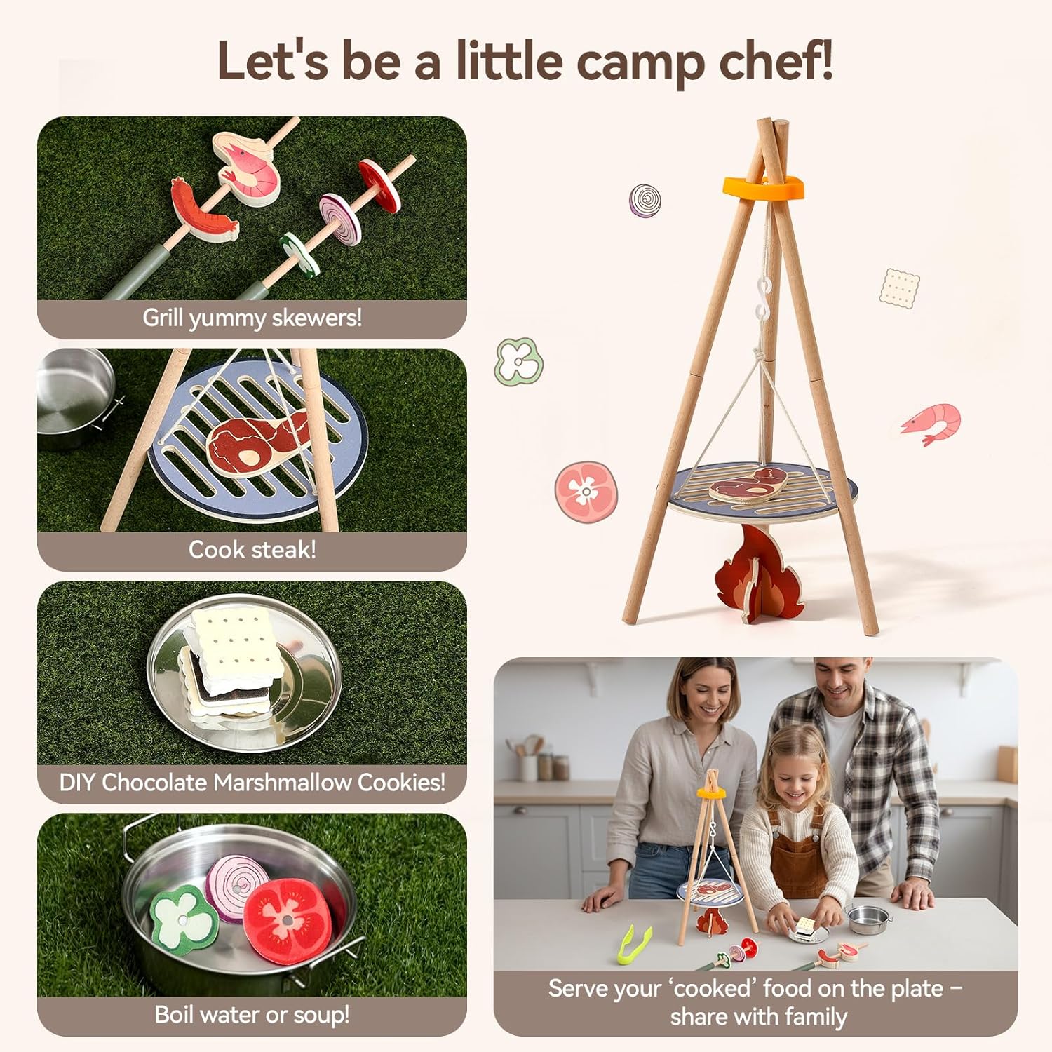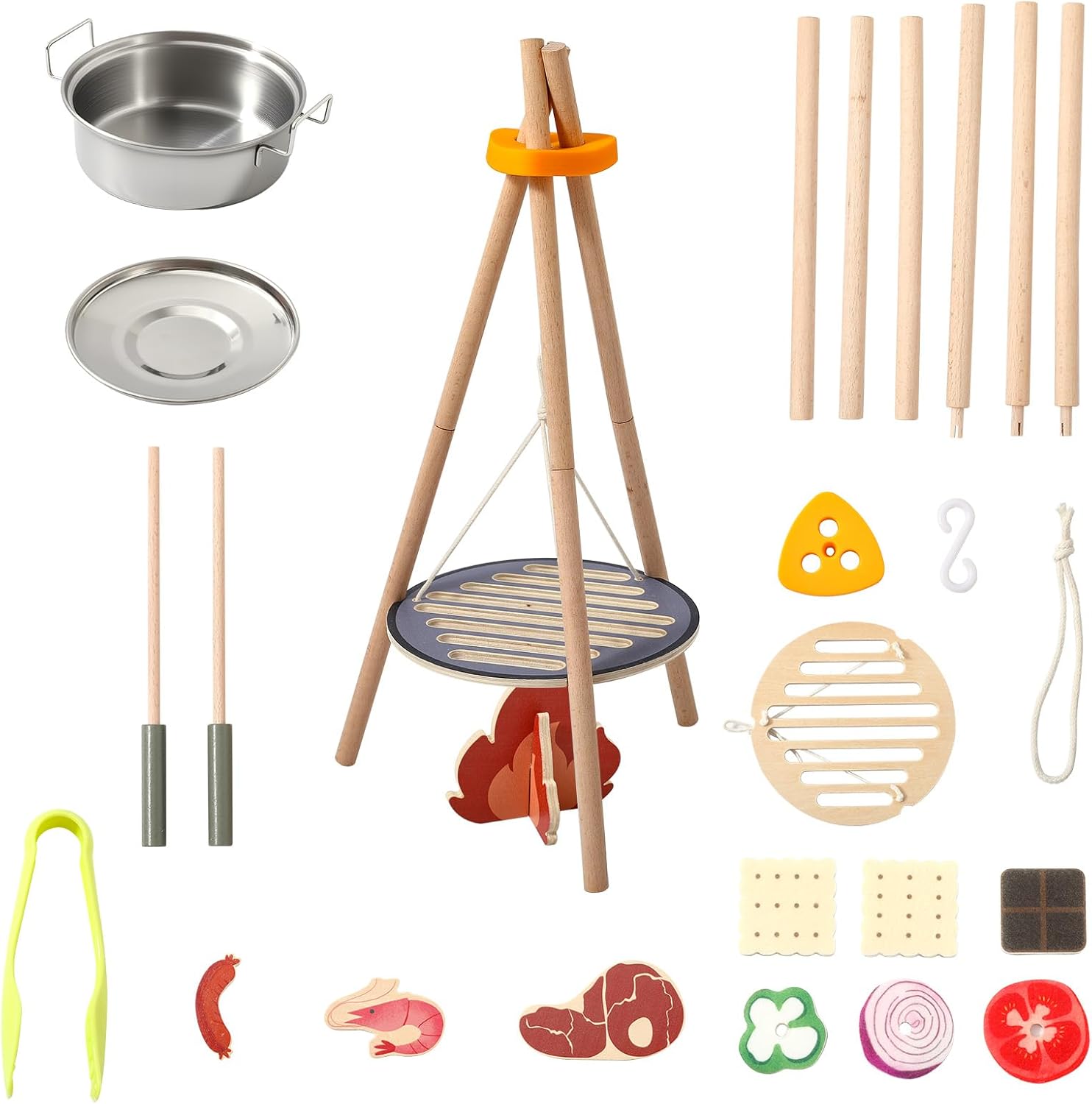 Wooden Campfire Grill Kids Camping Toy Set – Immersive wooden kids camping toy set with a tripod campfire grill, hanging grate and flame base. This compact tabletop campfire play set sets up quickly indoors or in the backyard, perfect for pretend camping, family BBQ role play and outdoor-adventure stories