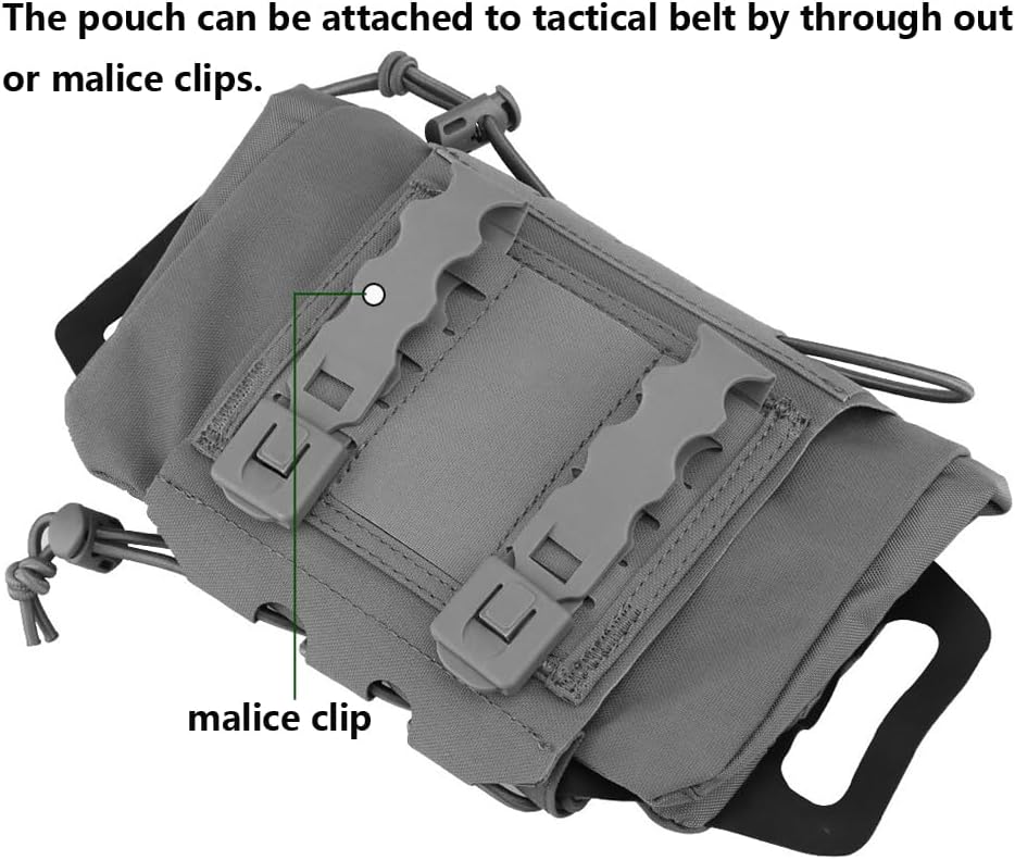 Attached to tactical belt or vest by through out or malice clips