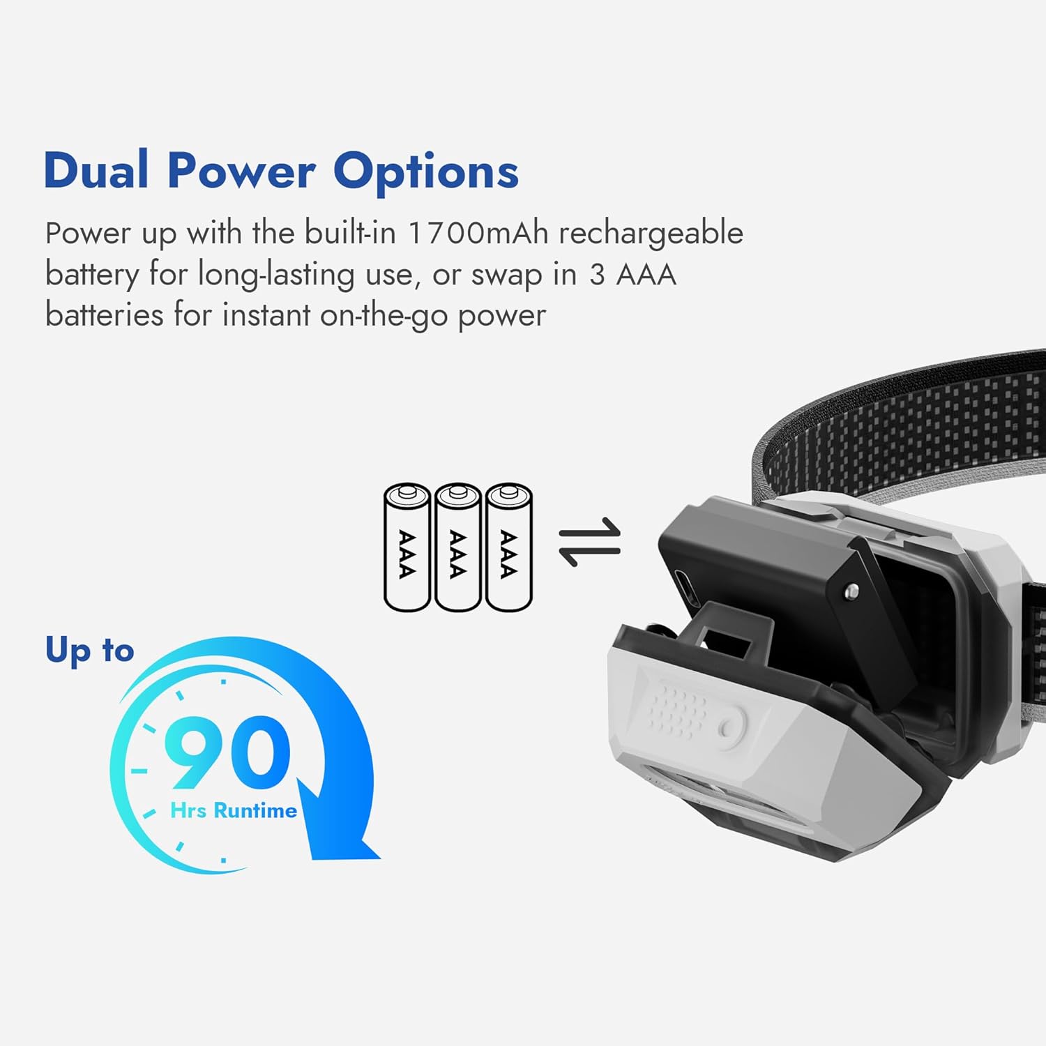 LIGHTWEIGHT AND PORTABLE: The overall weight of the headlamp itself is only 89 grams (137 grams including the battery) .Size: 1.47× 1.04 × 3.77 inches making it light and compact, saving you space, At the same time, we are equipped with an ergonomically designed high-quality breathable headlamp webbing with anti-slip and reflective pattern design, which can be easily adjusted to adapt to various head circumferences, bringing you a comfortable and secure wearing experience.