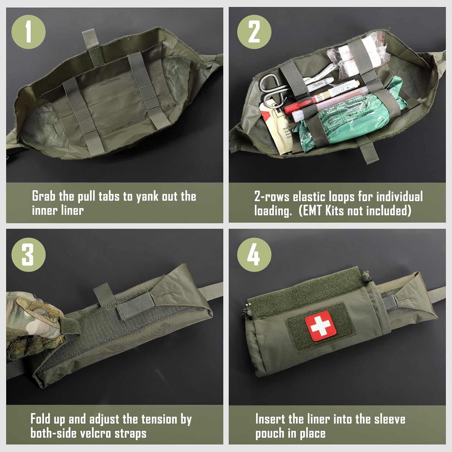 The inner insert can be adjusted by the Velcro retention tap on both sides according to supplies loading.