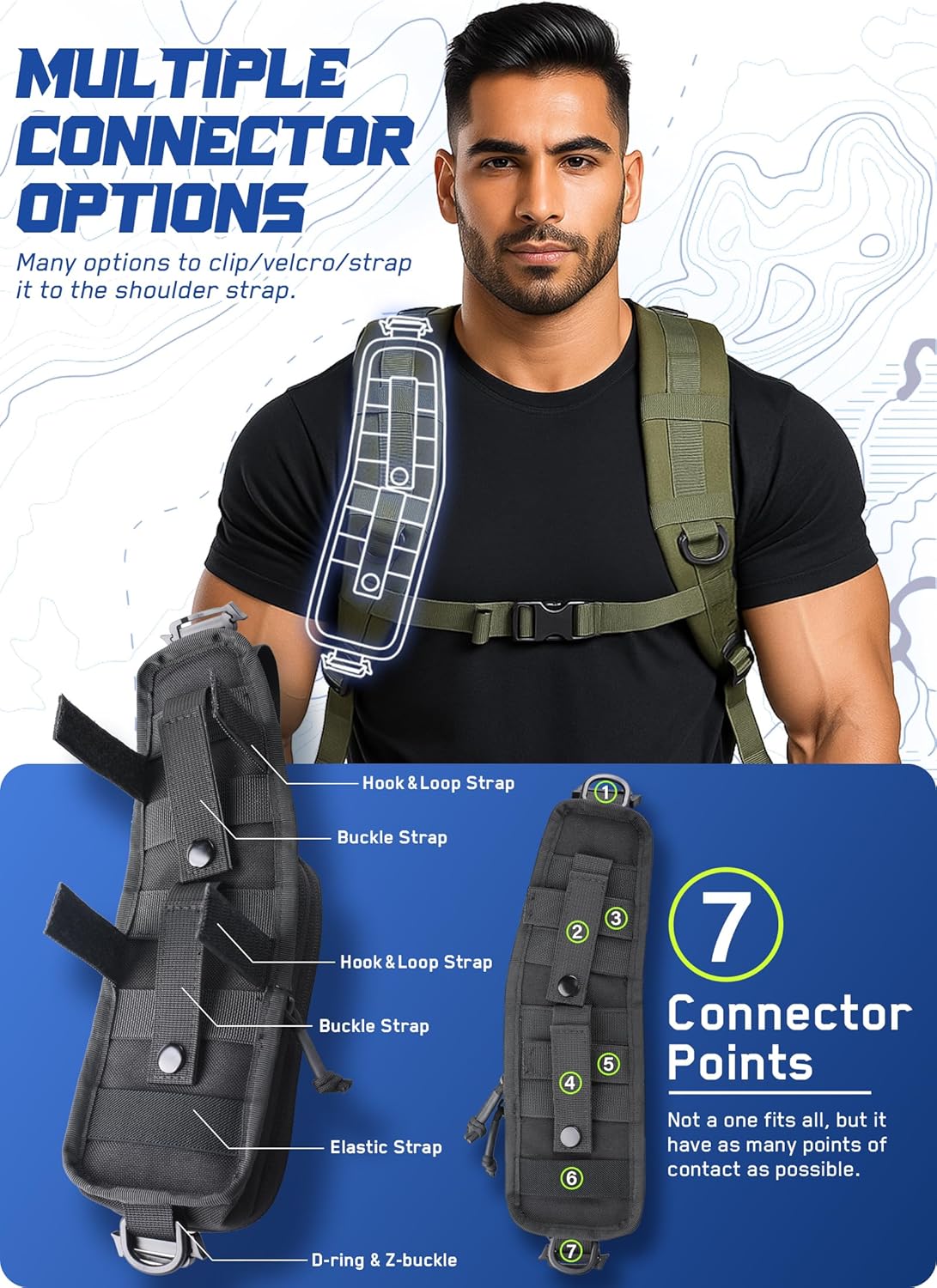 4-Way Attachment Options: Shoulder strap pouch can be anchored via 2 * Molle straps/2-way Z-Buckles/2 * hooknloop straps for vertical/horizontal mounting. For added stability on your shoulder strap, an extra hook-n-loop strap can wrap around the neck of backpack strap pouch, locking molle accessories in place and preventing slippage.