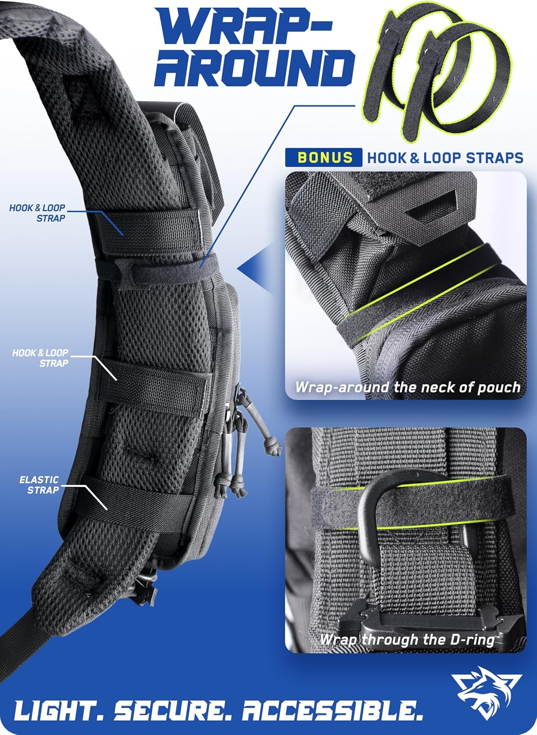 4-Way Attachment Options: Shoulder strap pouch can be anchored via 2 * Molle straps/2-way Z-Buckles/2 * hooknloop straps for vertical/horizontal mounting. For added stability on your shoulder strap, an extra hook-n-loop strap can wrap around the neck of backpack strap pouch, locking molle accessories in place and preventing slippage.