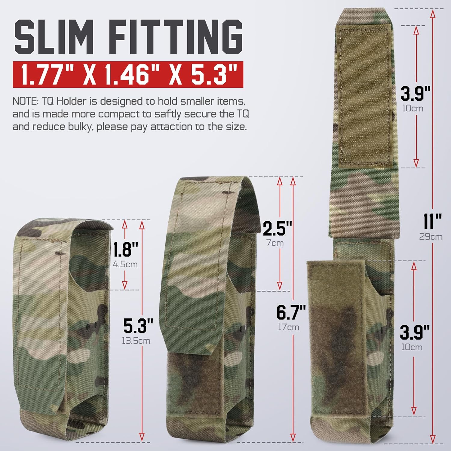 PLEASE NOTE: TQ Holder is designed to hold smaller items, and is made more compact to saftly secure the tourniquet and reduce bulky, so please organize your tourniquet before putting it.