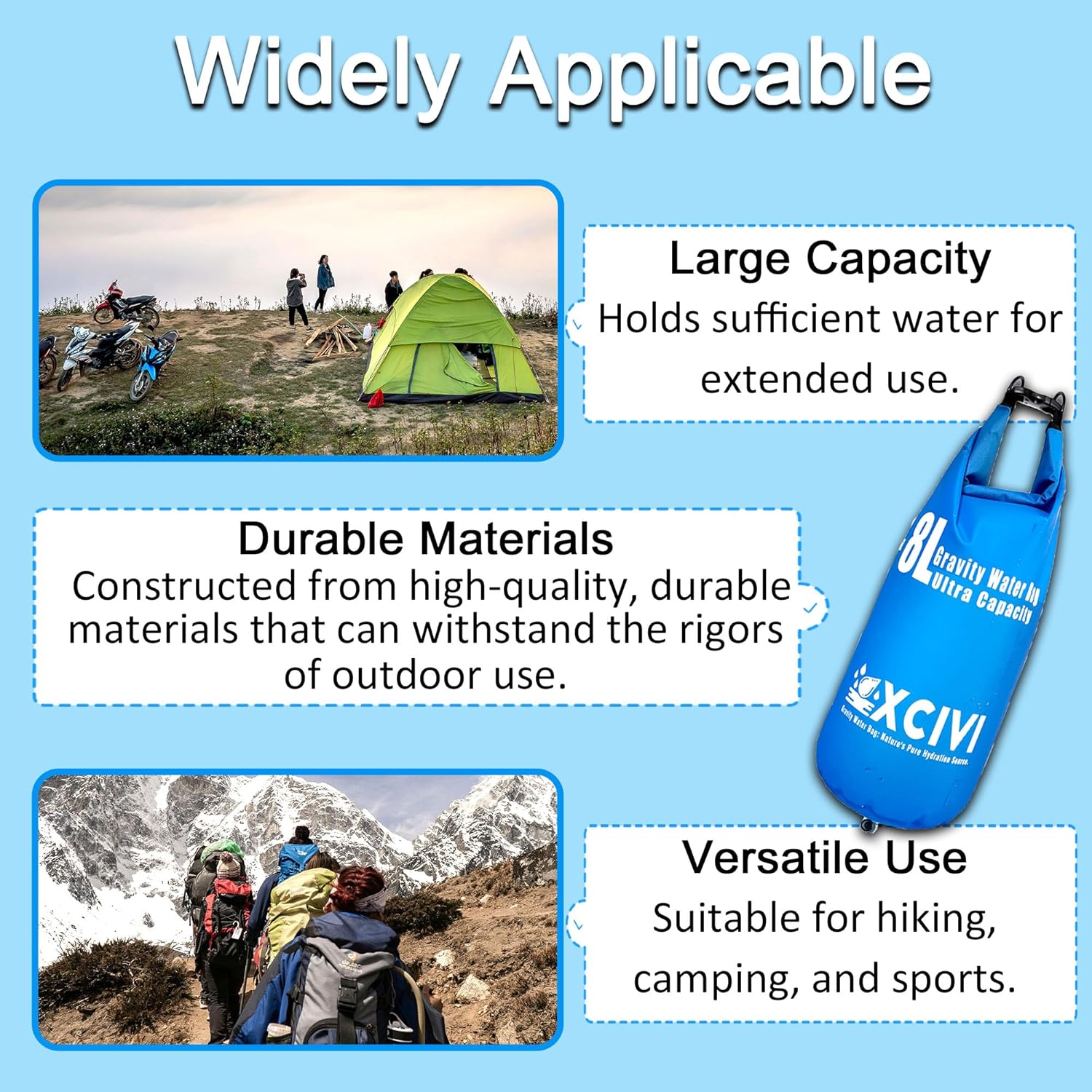 High-capacity: The Gravity Water Filtration System is equipped with a 2 – gallon gravity water filter bag, which is approximately equivalent to 16 bottles of 500 – milliliter bottled pure water, sufficient to meet your all – day outdoor drinking water needs.