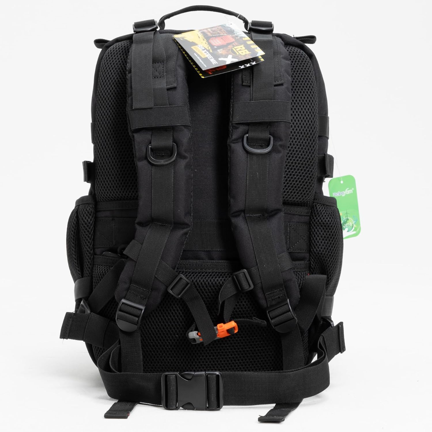 Durable and Weather-Ready — Tough fabric made from 900D recycled plastic bottles with a water-resistant finish. High-quality zippers, MOLLE and gear loops add utility. Rain cover included.