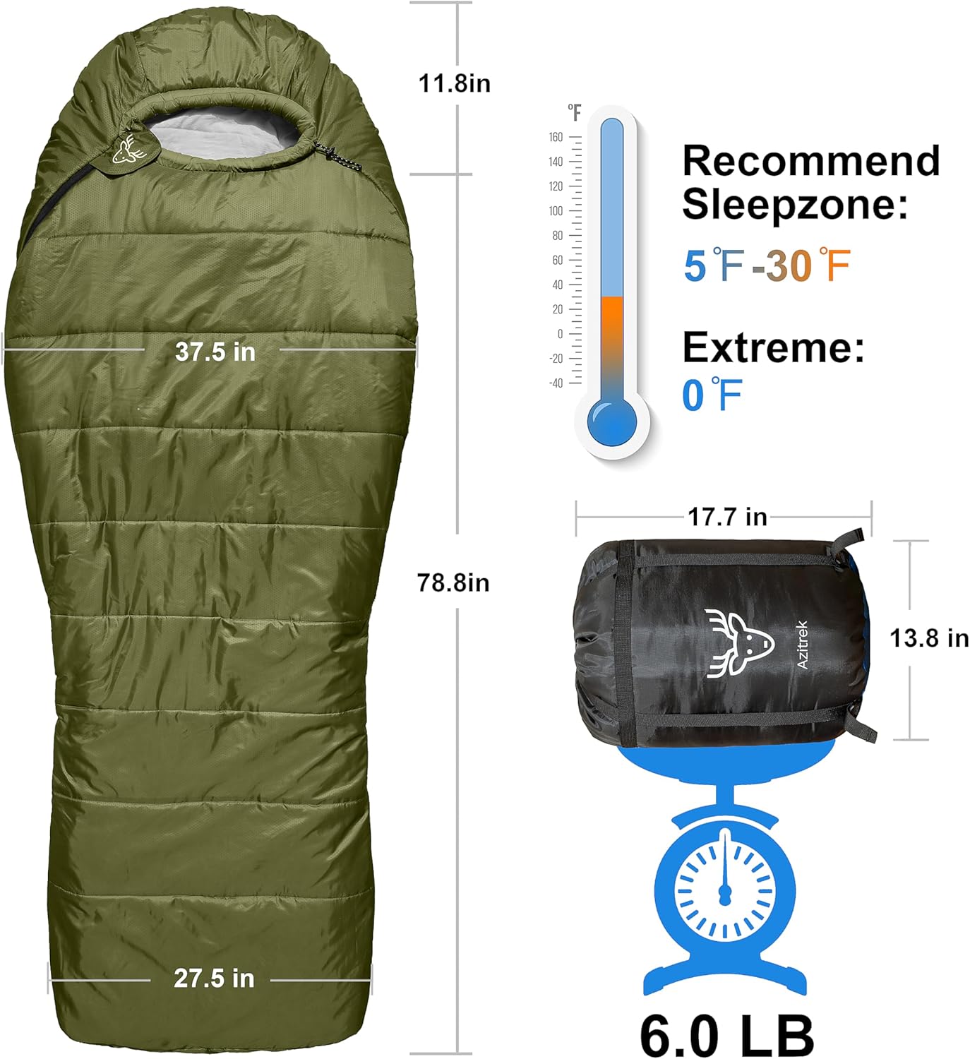 LUXURY PEANUT SHAPE COMFORT: designed for side sleepers, embrace the chilly nights with our peanut-shaped mummy winter sleeping bags for adults, youth, and even the big and tall campers, whether you’re camping, hiking, backpacking, or traveling. TEMP RANGE: 0F – 30F