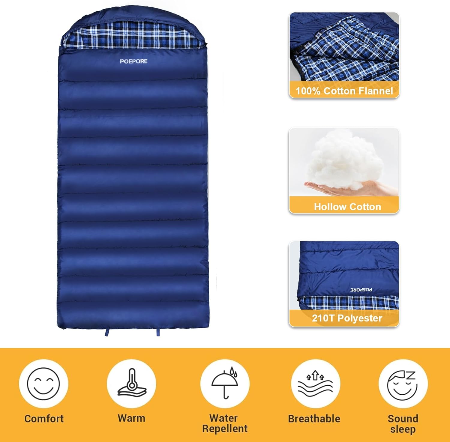 Double-Layer Filling: The POEPORE sleeping bag is lined with flannel fabric, which is soft and comfortable. Both the top and bottom layers are filled with 500g/m² (2*250g/m²) hollow cotton to prevent heat loss. The double-layer hollow cotton filling provides excellent insulation, keeping you warm and comfortable on cold nights without worrying about low temperatures.
