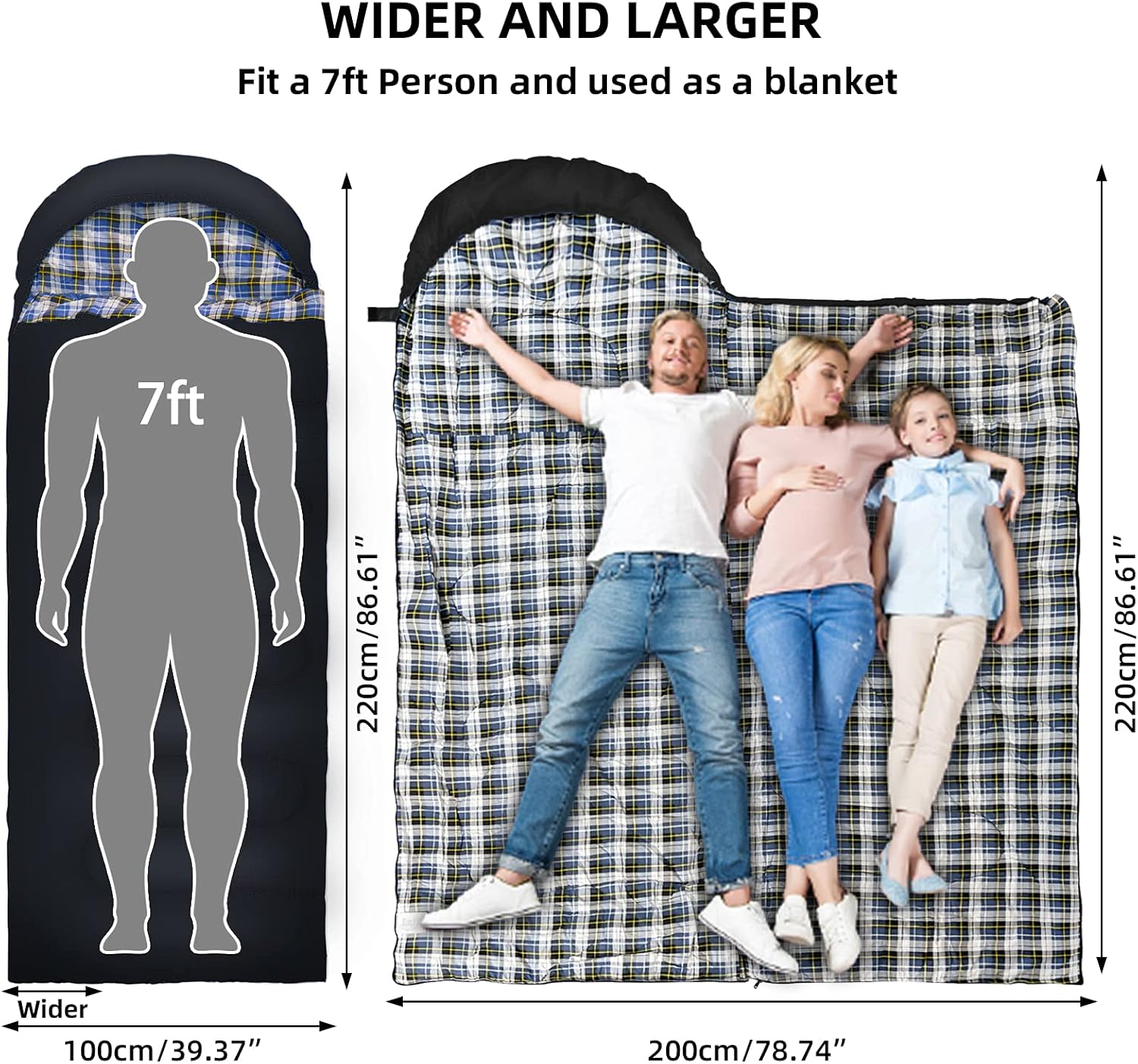 【Cozy Sleeping Bag for Adults】Wider design – 39″ (W) x 87‘’(L) , comfortable large sleeping bag size for big and tall people; Its wide and long enough for the person who is a large, tall man around the middle and the shoulders, enjoy a good night’s sleep with this sleeping bag while you are car camping