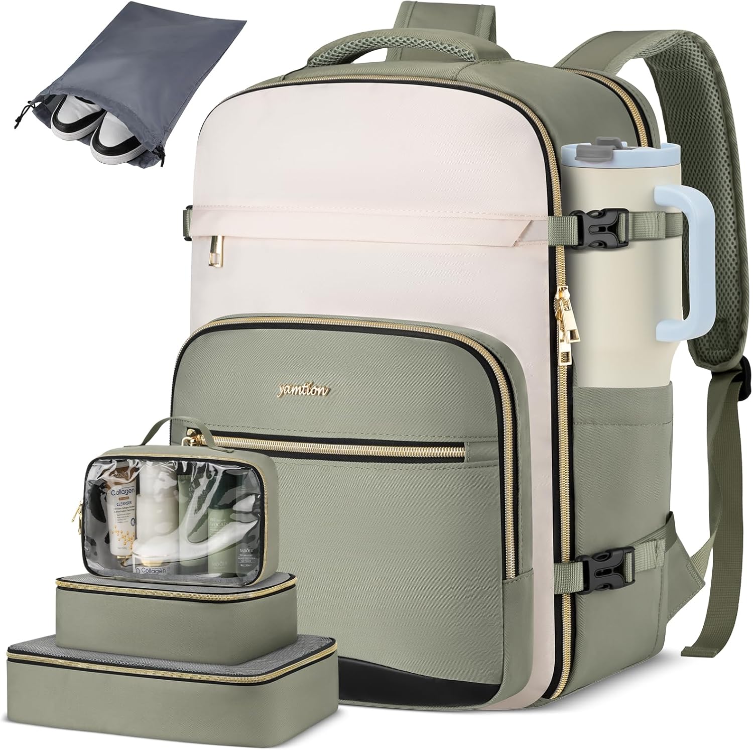 【4 Extra Packing Cubes for Storage】Comes with4 extra packing cubes, this personal item travel backpack offer enough space for storing clothes, toiletries and your shoes. And the wet/dry seperation design of the travel backpack prevent any leaks or moisture from affecting your other personal items.