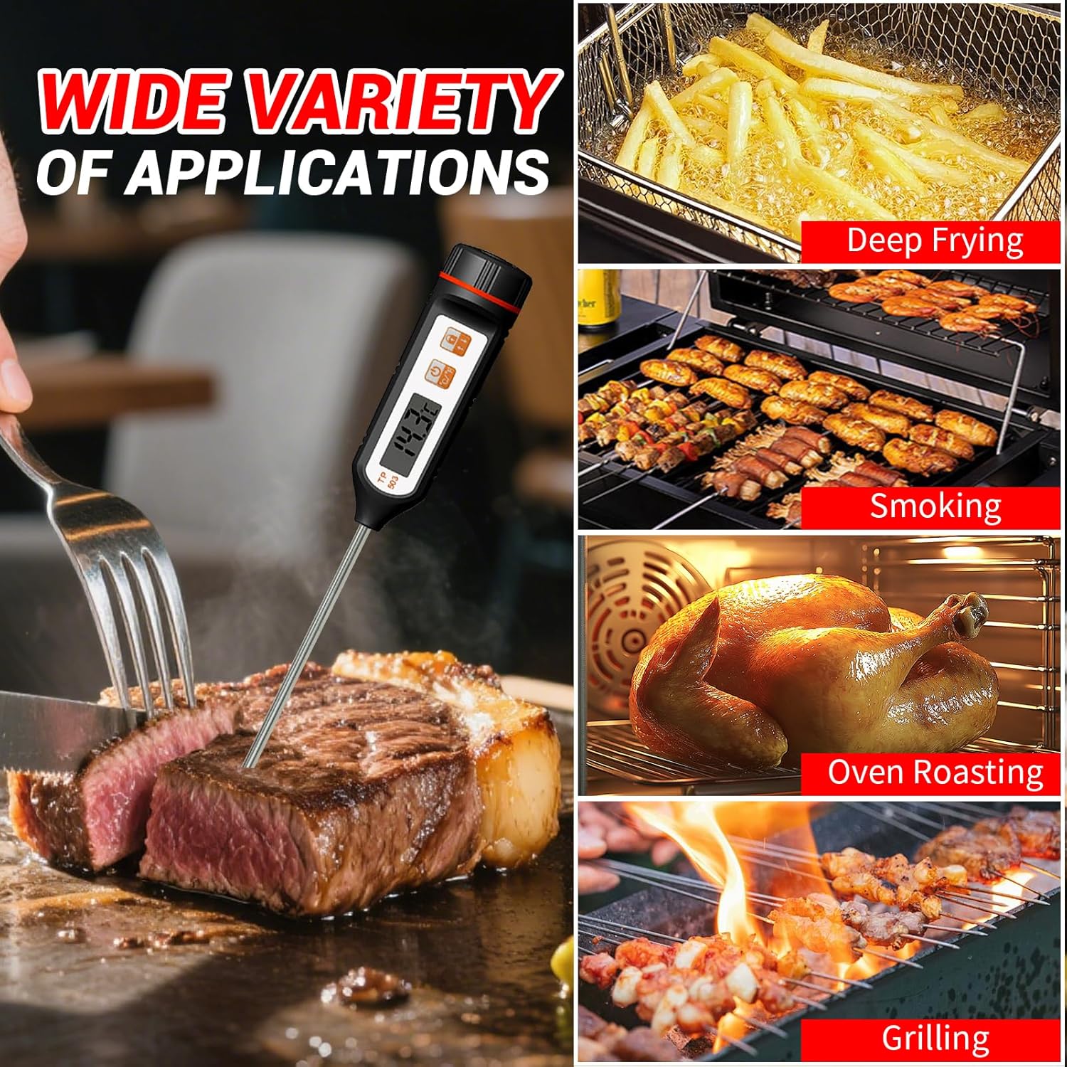 【Ultra – Fast & Accurate Readings】: Get precise temperature measurements within seconds, ensuring your cooking, frying, grilling, and baking are always at the perfect temperature. Ideal for everything from searing steaks to deep – frying and baking delicate pastries.