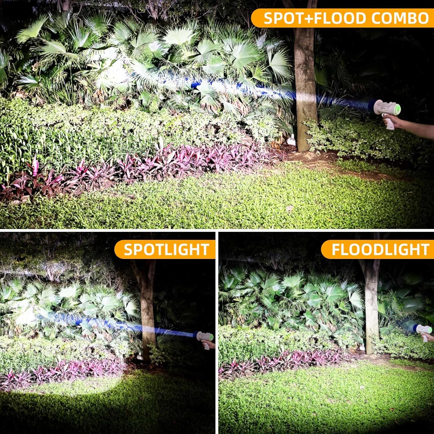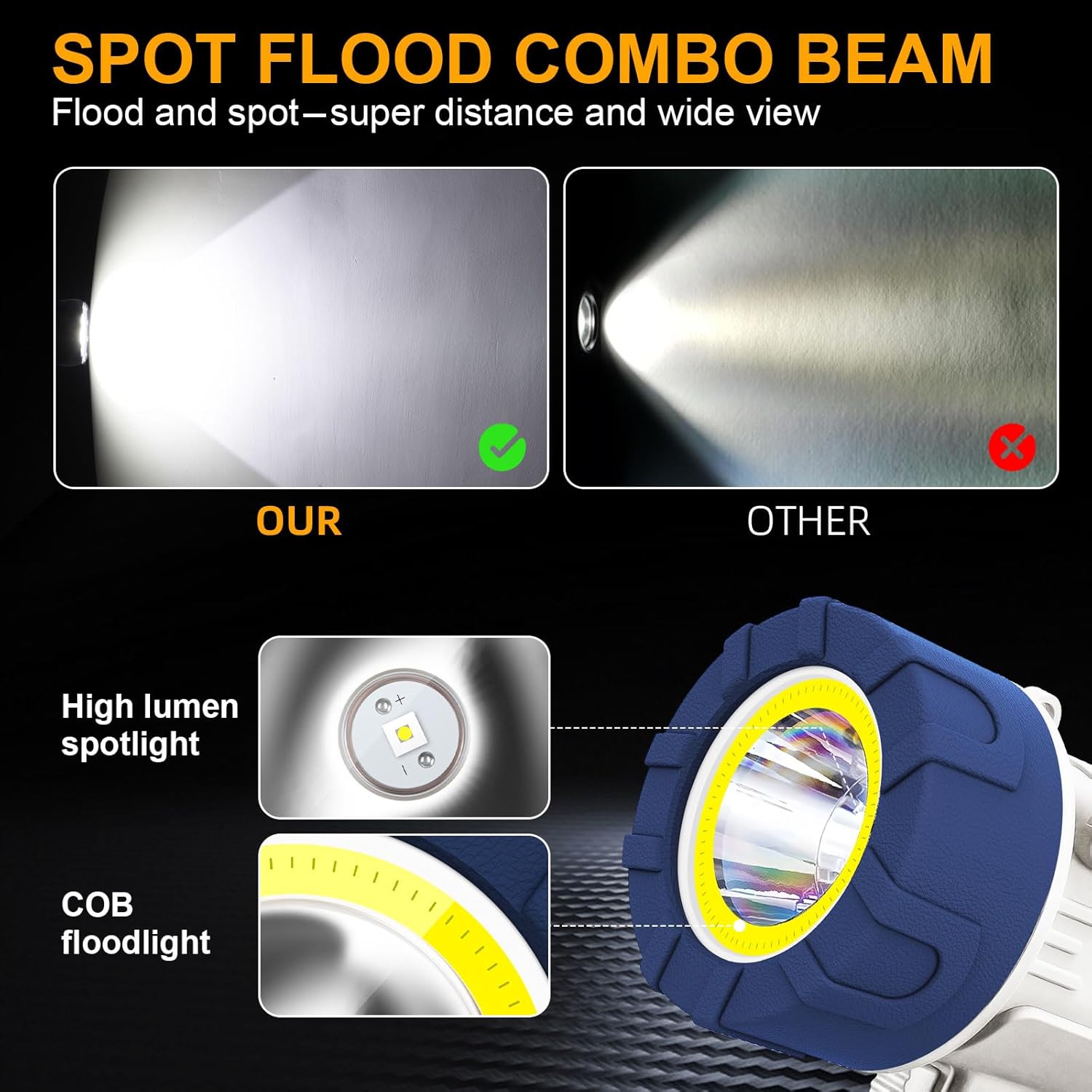 SPOT FLOOD COMBO LIGHT: This extra bright LED spotlight + COB Floodlight casts a high lumen beam out to an incredible 550 yards and a wide view. The COB floodlight compensates for the narrow beam of the spotlight, can be used alone as a work light. LEDs boast an extended 50000-hour lifespan. Features 6 adaptable settings: Spot+Flood / Spot High / Spot Low / Flood High / Flood Low / SOS(Long press 3 seconds).