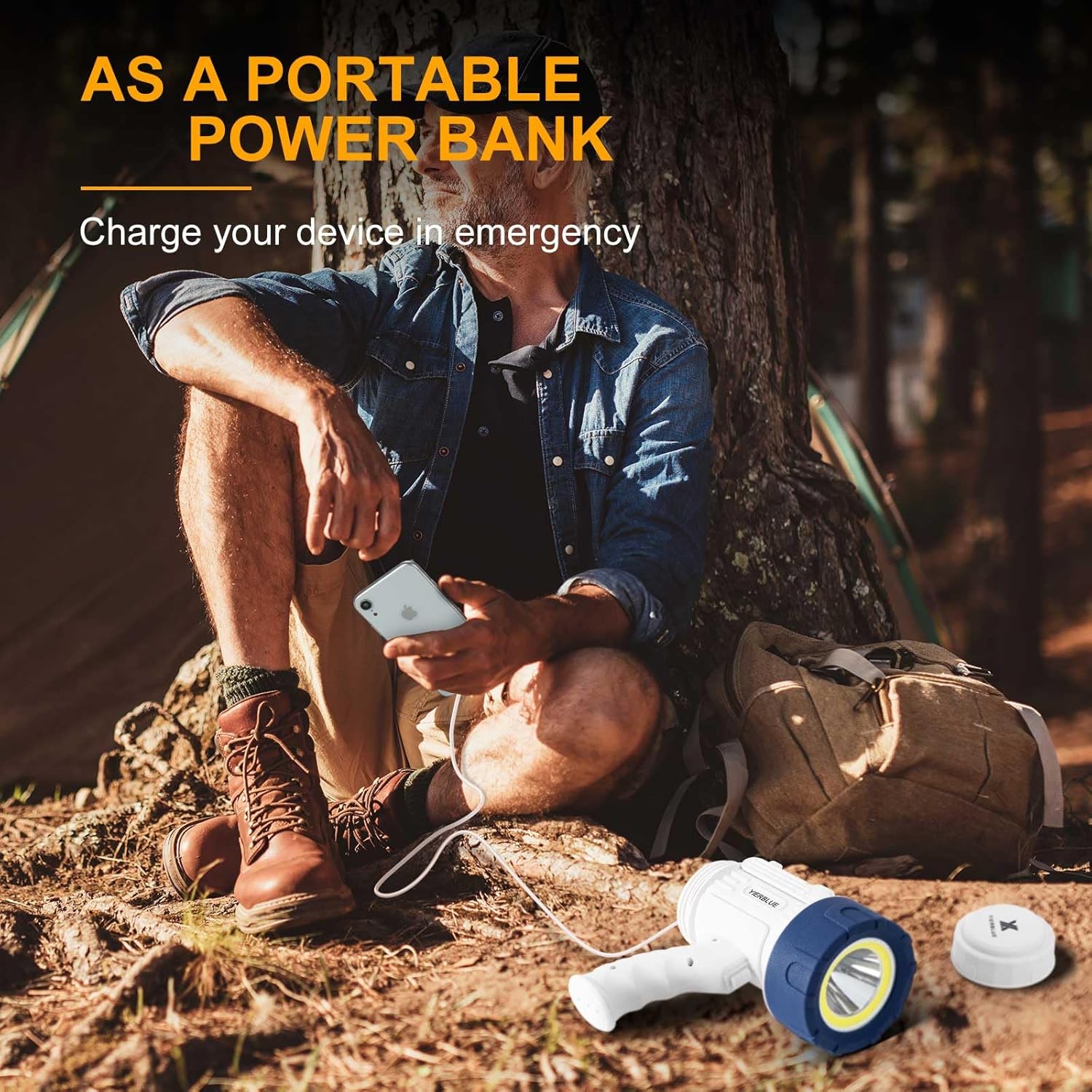 LONG TIME LIGHTING & POWER BANK: Built-in rechargeable batteries, YIERBLUE’s proprietary battery technology give you up to 9 hours lighting on lower settings, 3 hours lighting on higher settings. An output port built into the spot light can be used as a power bank to charge your devices in emergency.