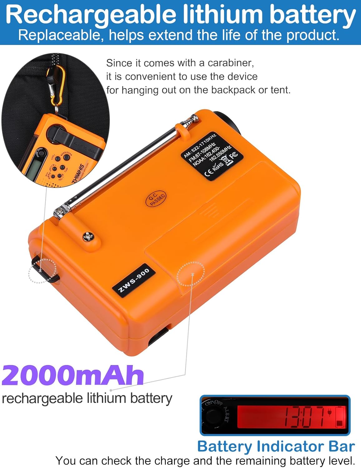 Rechargeable Radio: Equipped with 2000mAh lithium batteries, the rechargeable radio comes in three charging modes – solar, hand crank, and micro USB