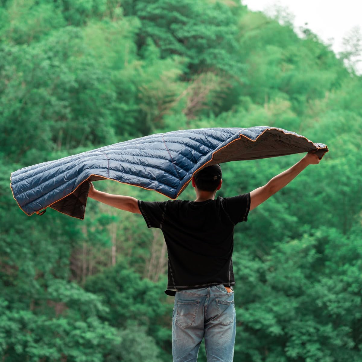 Unwind in Cozy Comfort: Our camping blanket keeps you snug and warm, thanks to its premium 650 fill power down. Whether it’s a chilly night under the celestial canopy or a summer breeze by the lakeside, it’s your trusted companion. When your adventure rests, tuck it into the included mesh bag, ensuring its perpetual fluffiness.